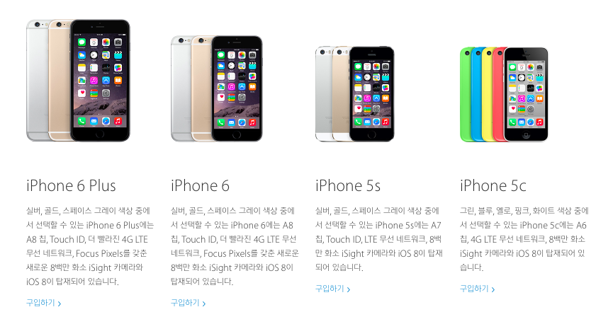 하지만 아이폰이라면 선택은 쉽습니다. 가장 좋은 폰은 아이폰6, 조금 저렴한 모델은 아이폰5s, 더 저렴한 모델은 아이폰5를 선택하면 그만입니다. 3가지 기기 모두 최신 운영체제가 지원되고, 거의 모든 애플의 앱과 서비스가 구동됩니다. 다른 것은 하드웨어의 성능 차이일 뿐입니다. |