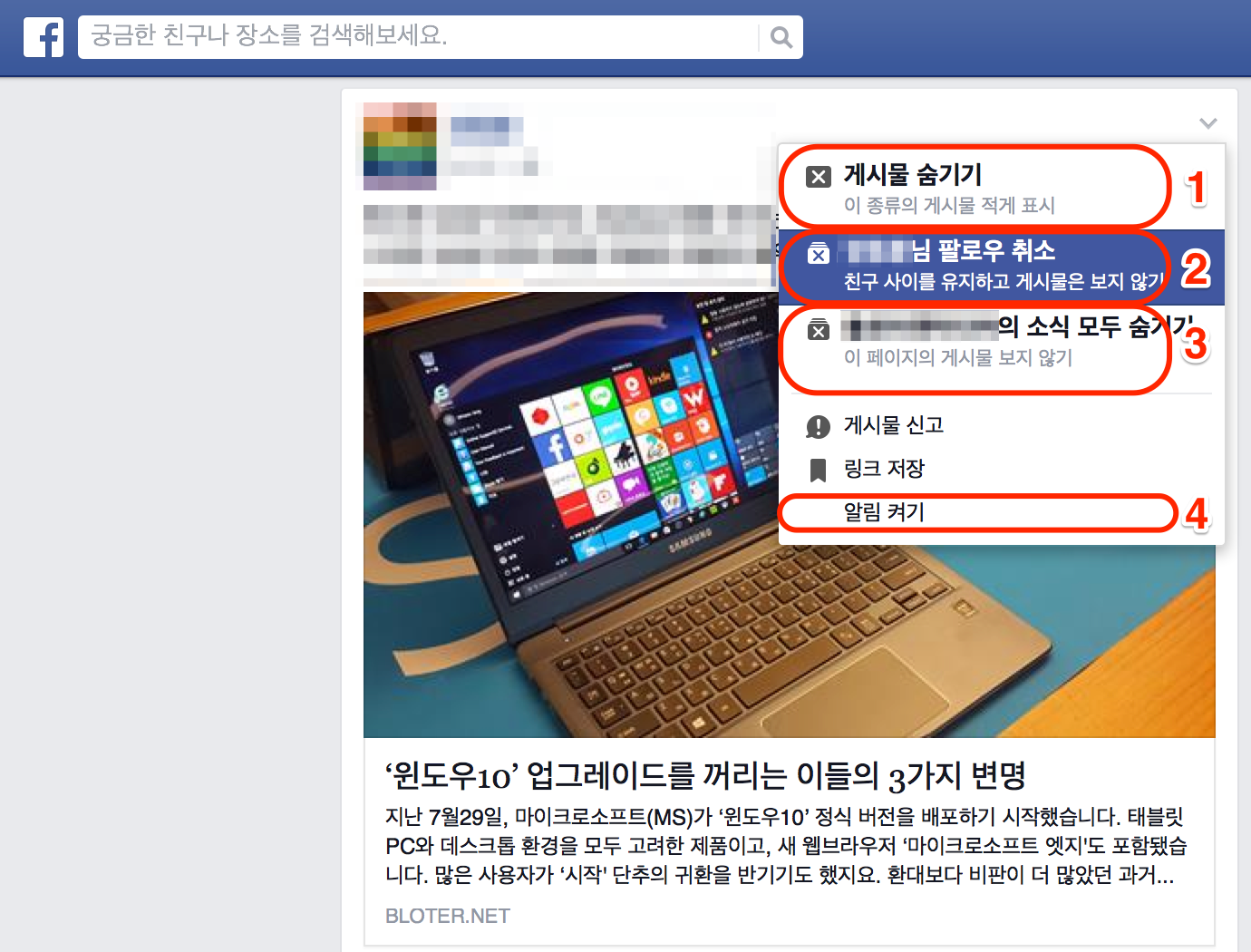 ➌ [ㅇㅇ의 소식 모두 숨기기] - 해당 페이지의 게시물이 나타나지 않습니다.