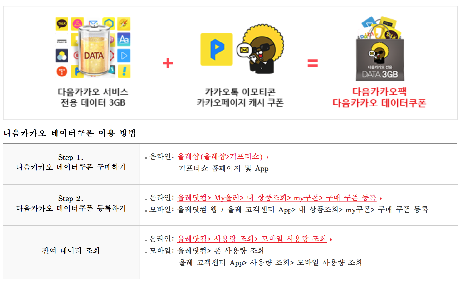 카카오톡과 다음 앱을 통한 웹서핑, 이외에 다음카카오에서 내놓은 수십가지 앱을 활용한 데이터 이용시 제공되는 3기가를 활용할 수 있는 것인데요.