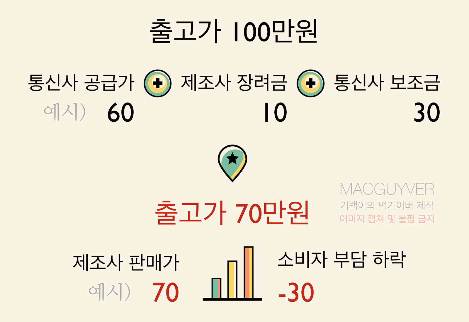 | 이를테면, 소비자들이 아는 기기의 판매 가격에는 통신사가 공급받는 가격에 통신사의 지원금 + 제조사의 장려금이 더해져 있었습니다. (물론 애플은 별도의 제조사 장려금이 없다고 알려져 있습니다) 만일 출고가가 100만원이라면, 예를 들어 통신사에는 60만원에 공급하면서 통신사 지원금을 30만원으로, 제조사 장려금을 10만원으로 책정해서 소비자들에게는 100만원으로 판매하는 것이죠. |