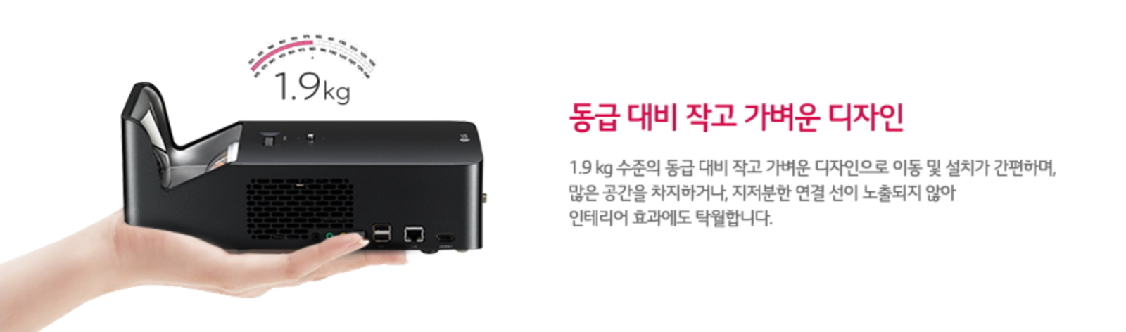 1.9Kg의 비교적 가벼운 무게, 심플한 디자인, 초단거리 100인치 화면 투사, 1,000안시의 밝은 화질은 이 제품의 가치를 더욱 높여줄 것 같습니다.
