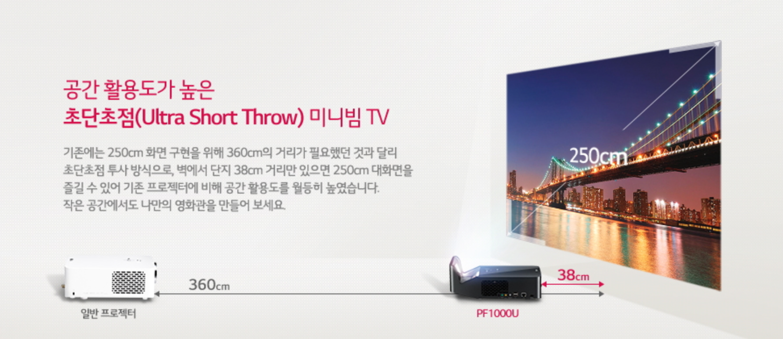 겨우 38cm 앞에서 100인치 화면을 투사할 수 있는 능력은 기존에 최소 3.6미터는 떨어져야만 가능했던 것에서 1/10로 줄어든 거리임을 알 수 있습니다.