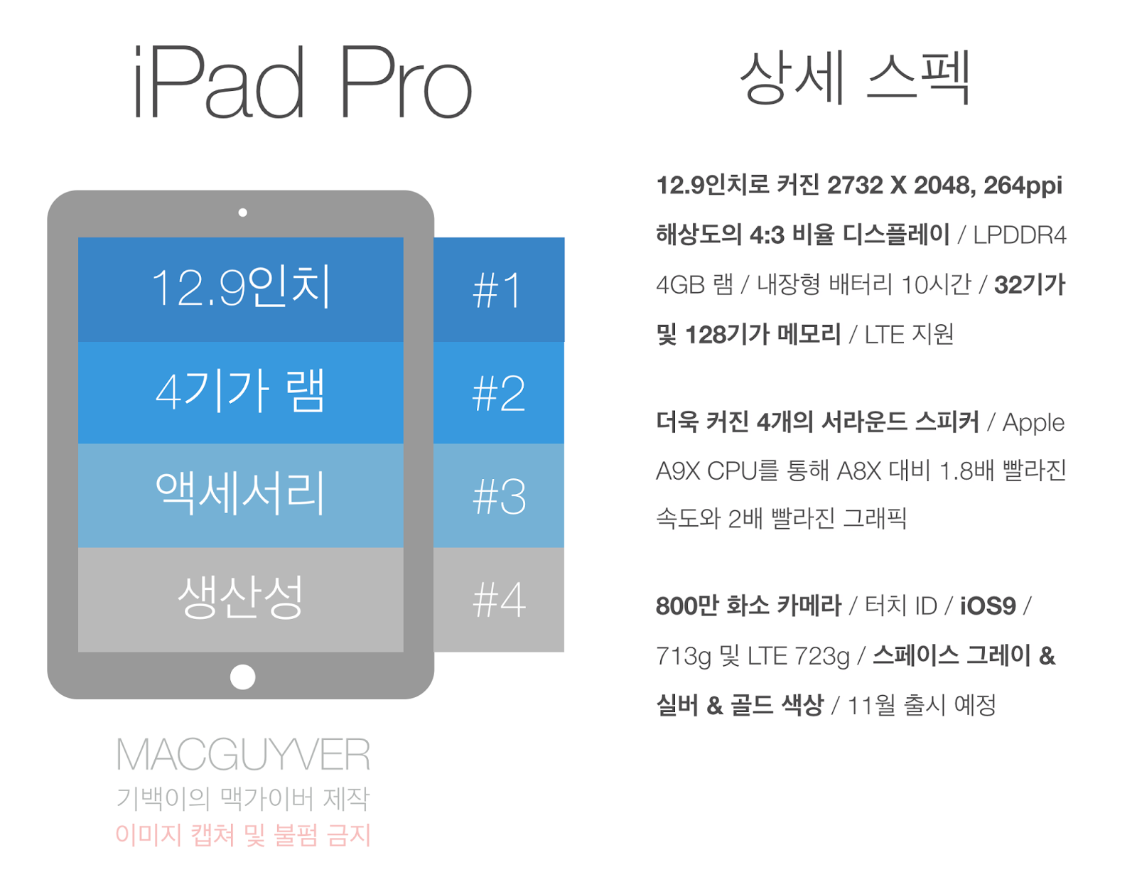 이미 지난 9월 9일에 아이폰6s와 함께 공개된 만큼 국내 출시도 동시에 진행될 가능성이 높은데요. 그만큼이나 이 거대해진 아이패드 프로에 대한 소식이 더 자주 들려오는 것 같습니다.