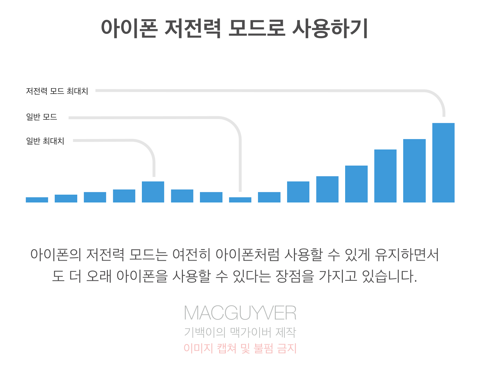 저전력 모드는 장시간 충전이 불가능한 상황에서 아이폰을 사용해야 하거나, 지속적으로 아이폰을 오랫동안 사용할 경우 전력 소모를 줄여줍니다.