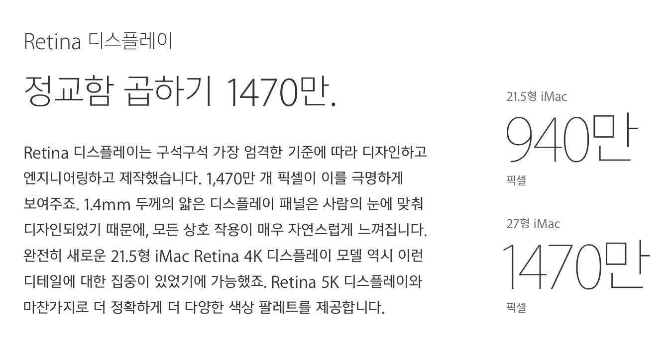 아무튼 이번 21.5형 아이맥 레티나 4K 모델을 통해서 시장의 확대를 노리는 애플은 21.5형이라는 대중적인 화면 크기를 활용해서 가격도 낮추고, 거의 모든 제품에 레티나를 채택하며 레티나의 대중화에 공을 들이는 것 같습니다.