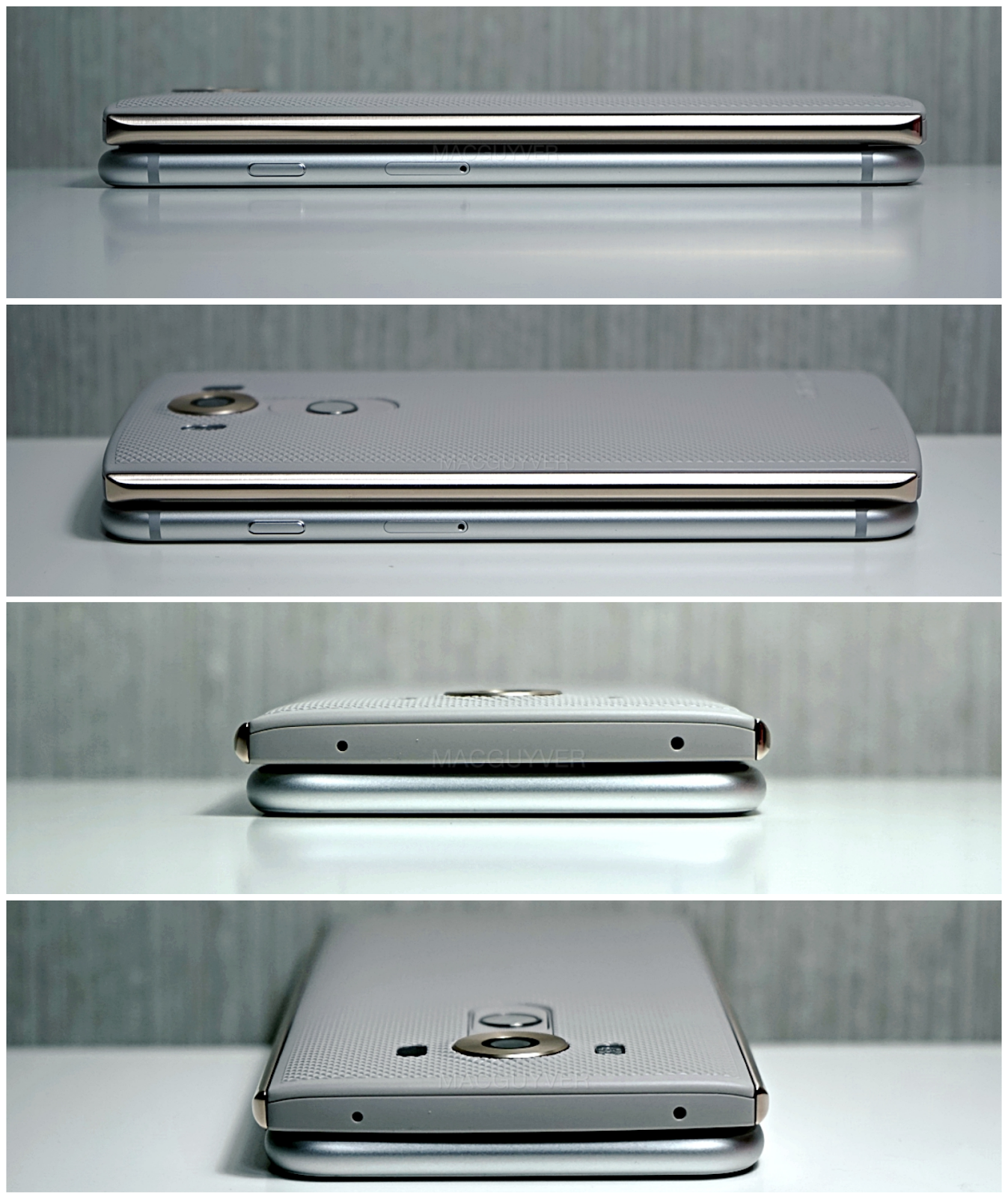 옆면과 윗면을 보게 되면, 역시나 엘지전자가 추구하는 '심플함'이 힘을 발휘하는 것 같습니다. 그 어떤 버튼도, 파티션도 없이 쭉 이어진 디자인이 심플함을 강조했는데요. 윗면의 경우는 아이폰이 더 심플했지만 V10도 나쁘지 않은 모습이었습니다 ▼