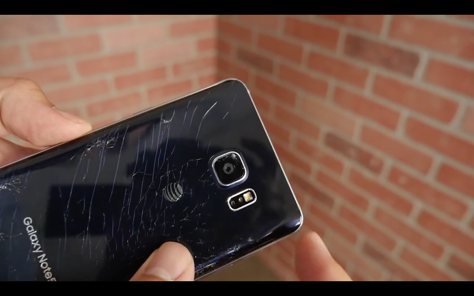 첫 후면 테스트 이후 바로 깨진 갤럭시노트5의 뒷면, 유리로 된 부분이다 보니 어쩔 수 없는 것 같습니다 ▼