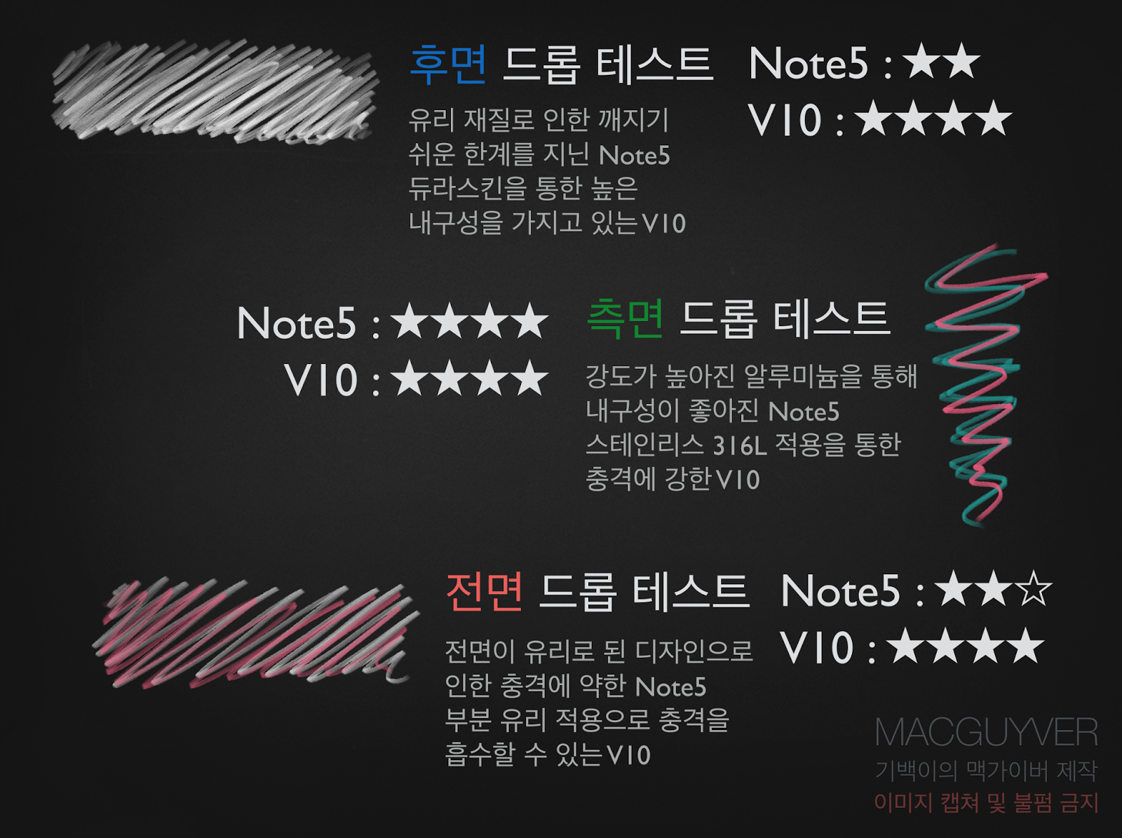 V10도 결국은 스마트폰이고, 유리로 된 액정이 장착된 폰이기 때문에 충격을 받는 위치나 상황에 따라서는 얼마든지 한 번에도 깨질지 모릅니다. 그러나 전체적으로 매우 튼튼한 내구성을 보여준 V10은 엘지전자의 이미지 쇄신에도 긍정적일 것으로 보입니다.