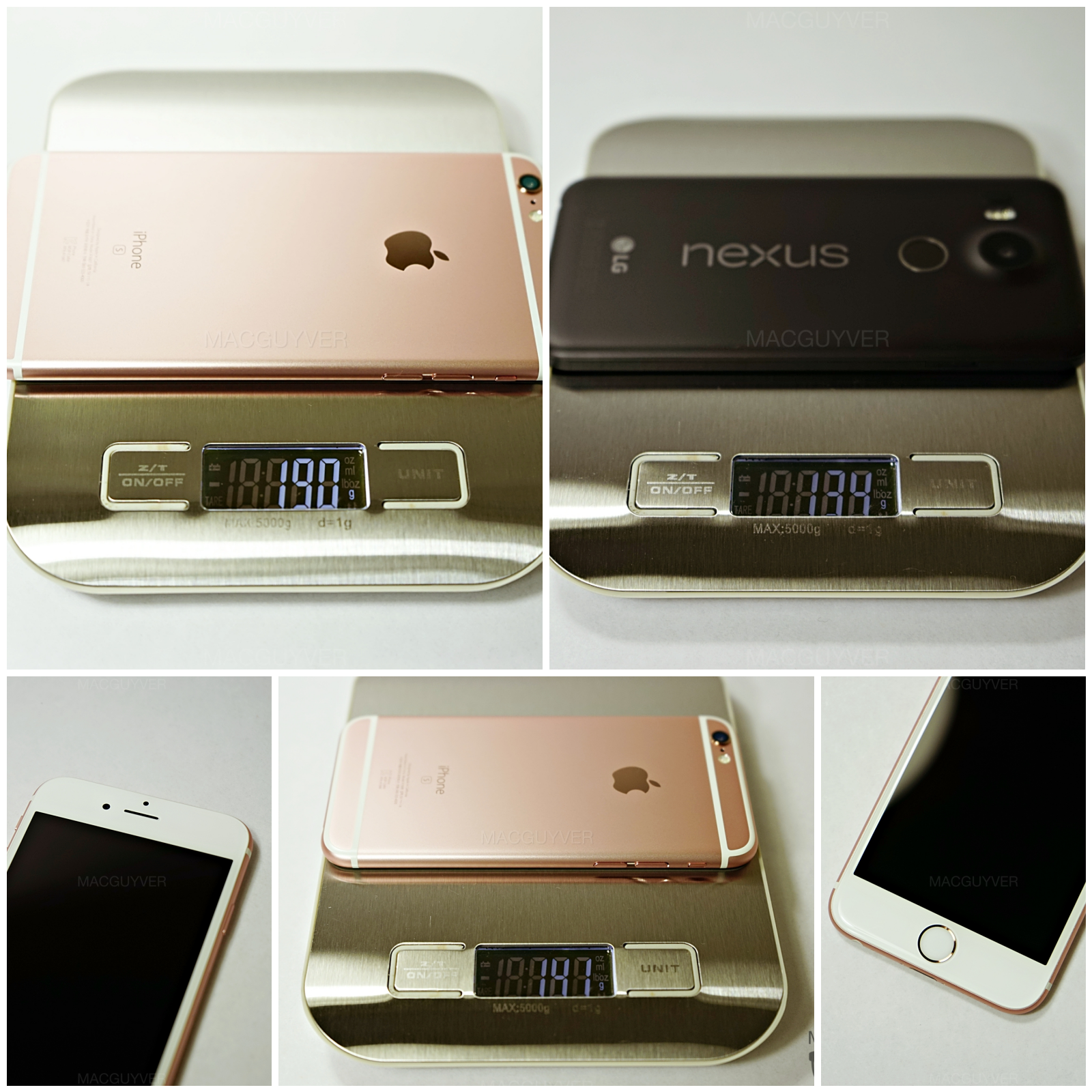 무게는 다소 무거워졌는데요. 아이폰6s 플러스는 190g이 넘는 무게를, 넥서스5x는 134g으로 극도의 가벼움을 보여줬다면, 아이폰6s는 141g으로 이전 모델 대비 약간 늘어난 무게가 눈에 띄었습니다 ▼