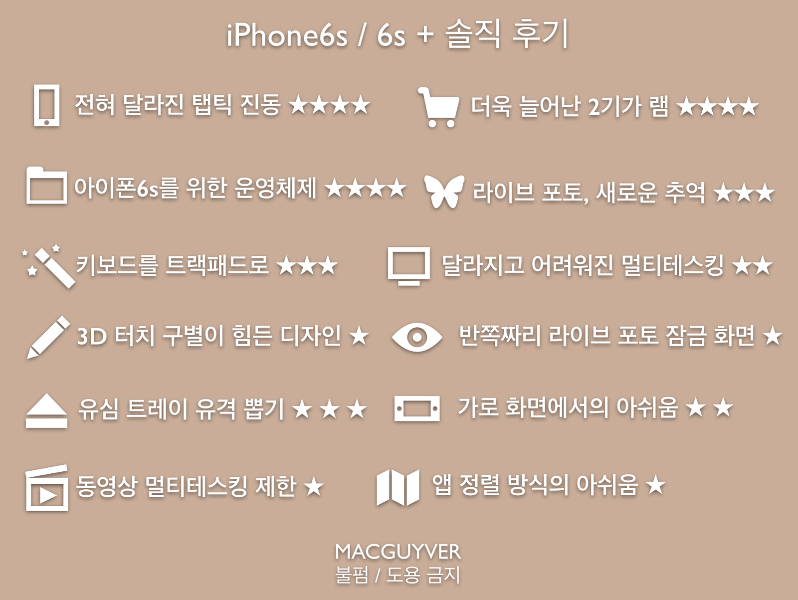 개인적으로 아이폰6s를 평가하자면 아이폰6가 아닌 아이폰 사용자라면 마음 놓고 건너와도 될 정도의 제품이라는 것. 그리고 안드로이드 사용자들이라도 큰 어려움 없이 쉽게 적응할 수 있는 제품이라는 것입니다. 이상, 맥가이버였습니다 :)