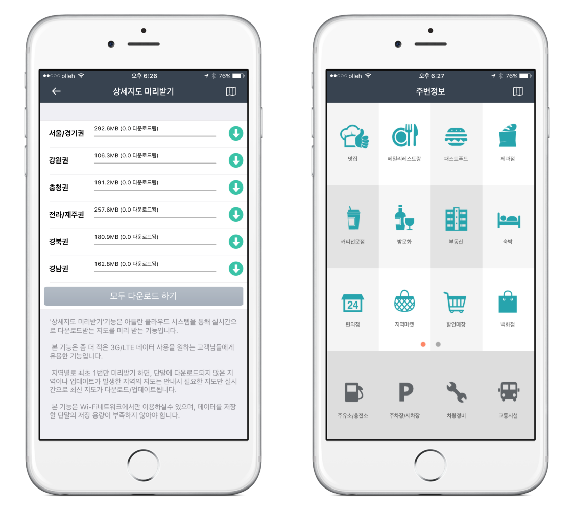 자신이 주로 이용하는 곳의 고화질 지도만 별도 다운이 가능해서 더욱 유용한 사용이 가능하고, 직관적인 버튼 메뉴와 아래쪽의 주유/차량 관련 위치 정보가 별도로 분리되어서 더욱 실용적이었습니다 ▼