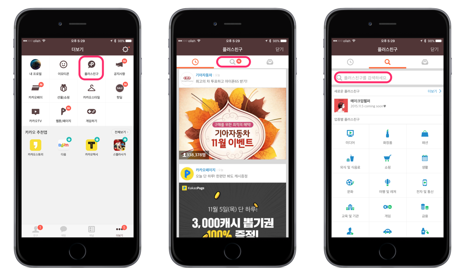 우선은 카카오톡을 실행해주세요. 그리고 '더보기' 메뉴에 있는 '플러스친구'를 찾아주세요. 플러스친구를 들어간 다음에는 '검색'을 누르면 됩니다.
