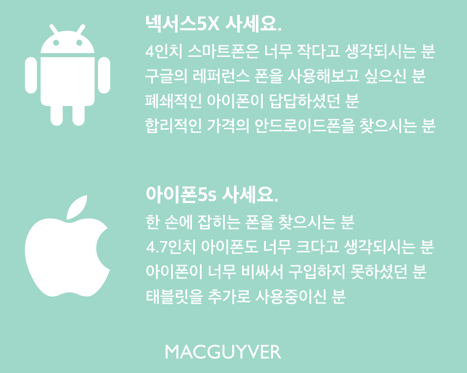 4인치의 매우 작고 컴팩트한 폰을 찾는다면, 또한 애플의 최적화된 운영체제를 찾는다면 아이폰5(s)도 좋은 선택이 될 것입니다. 또한 5.2인치의 적당한 크기에 가벼운 폰을 찾는다면, 그리고 구글의 최적화된 운영체제를 찾는다면 넥서스5X가 좋은 선택일 수 있습니다.