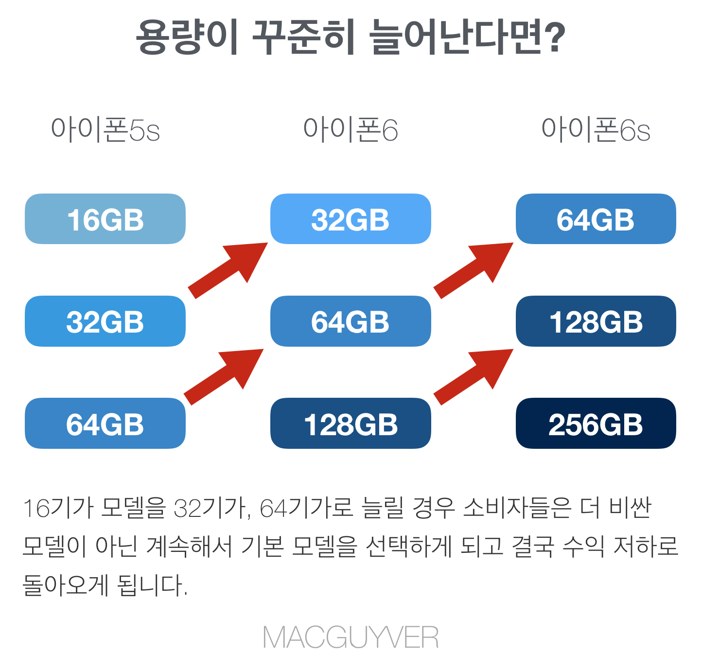 애플이 아이폰6를 내놓으며 변화시킨 것은 단지 더 커진 화면만이 아니었습니다. 기존에 16기가에서 32, 64기가로 3단계였던 용량 정책을 16기가 모델을 유지한 채, 64기가와 128기가로 변화시켰기 때문입니다.