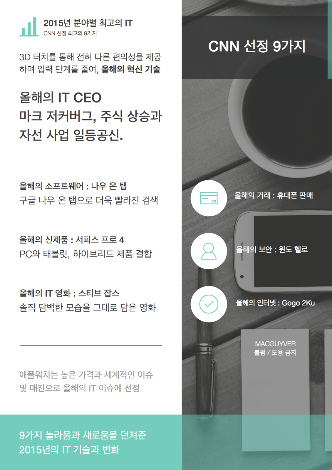 CNN은 지난 24일 2015년 IT 분야별 최고의 기술을 발표했습니다. 그 가운데는 우리가 익히 알고 있는 3D 터치부터, 최근 출시되며 이슈가 되었던 서피스까지 있었습니다.