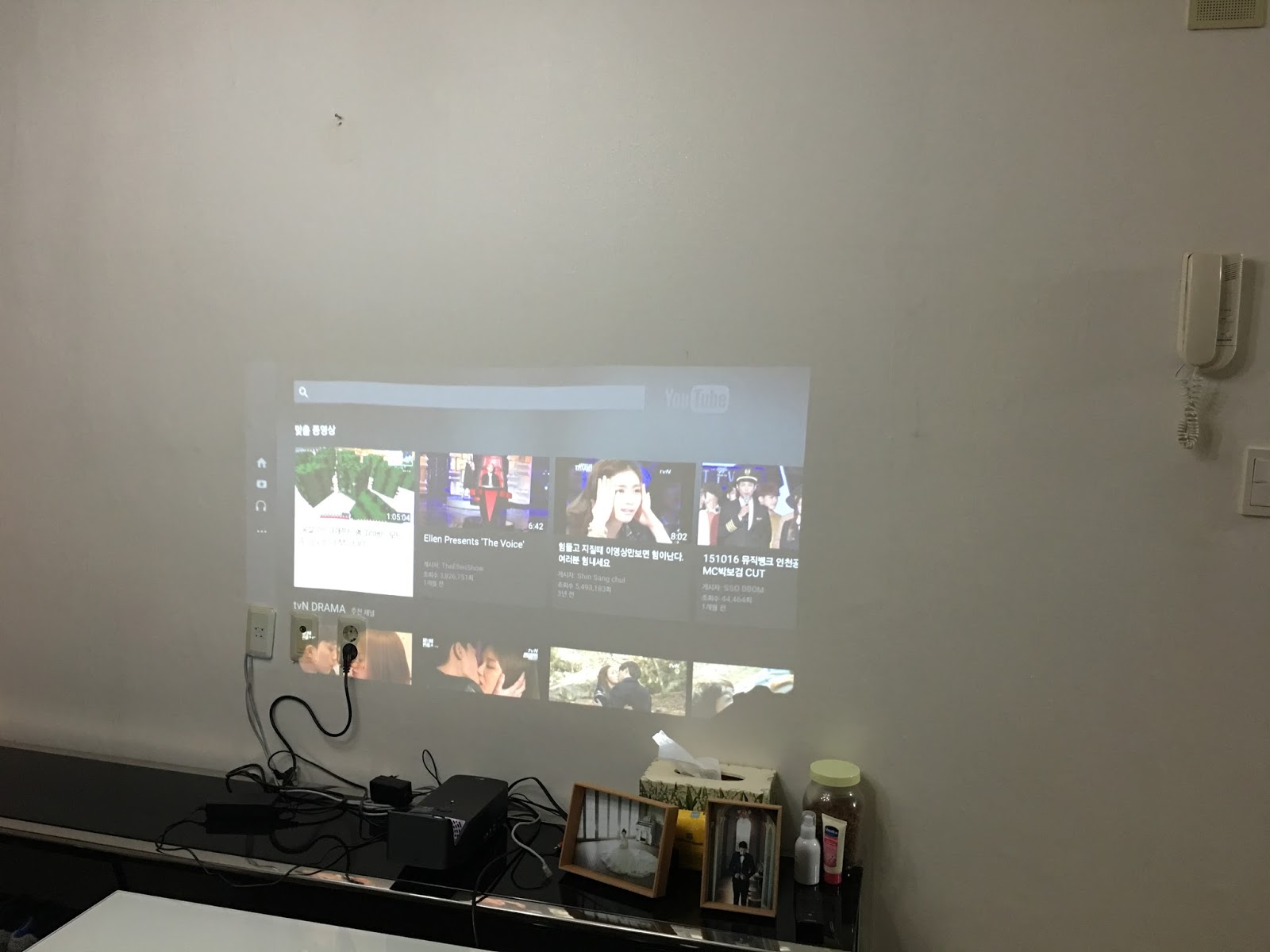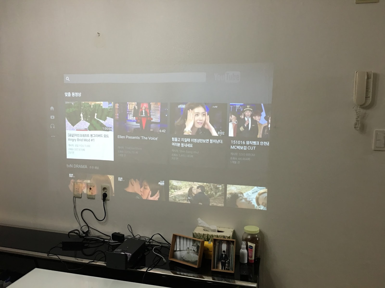 벽에 바로 붙어서 비춰본 화면, 작아 보여도 50인치가 넘는 크기입니다 ▼