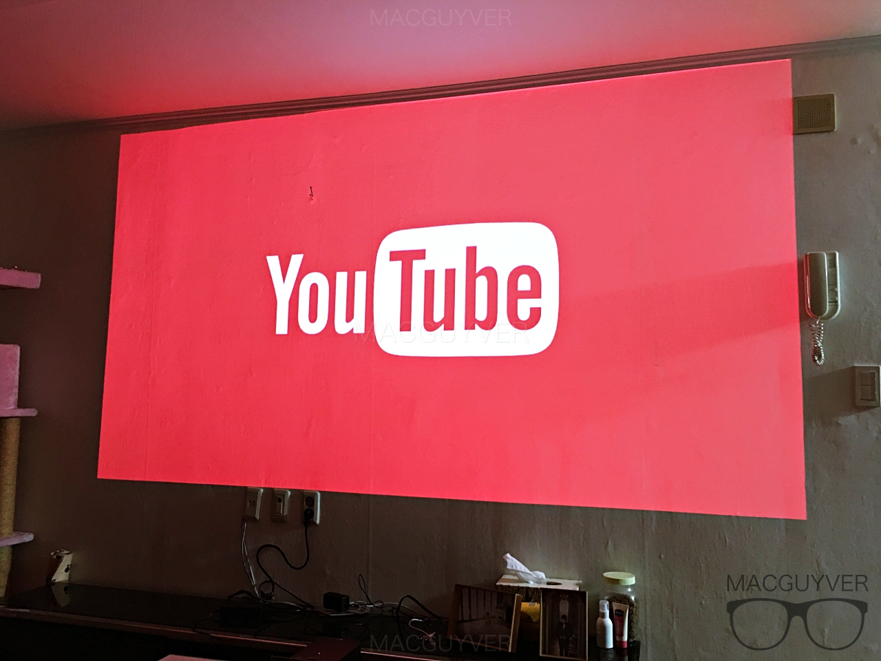홈씨네마로서 손색이 없는 모습을 보여줬습니다. 전용 스크린만 있다면 더욱 밝고 선명한 화면을 감상할 수 있지만, 그냥 하얀 벽지에 비추어도 충분히 극장과 같은 분위기가 느껴졌습니다 ▼