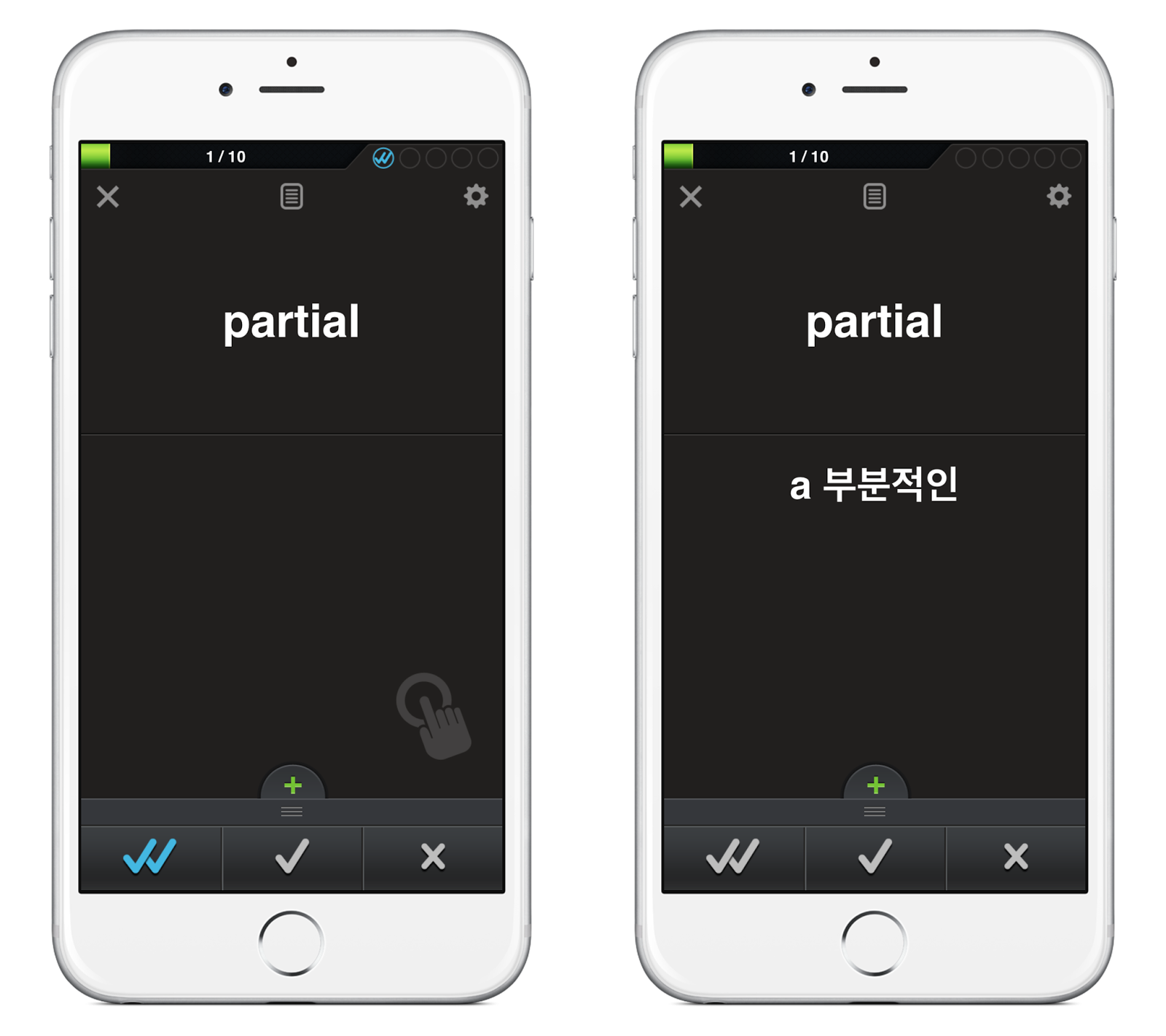 단어가 나타나고, 누르게 되면 한국어 뜻이 잠깐 나타납니다. 외웠다고 생각되면 하나의 체크를, 완전히 외웠다면 두 개의 체크를 선택하면 됩니다 ▼
