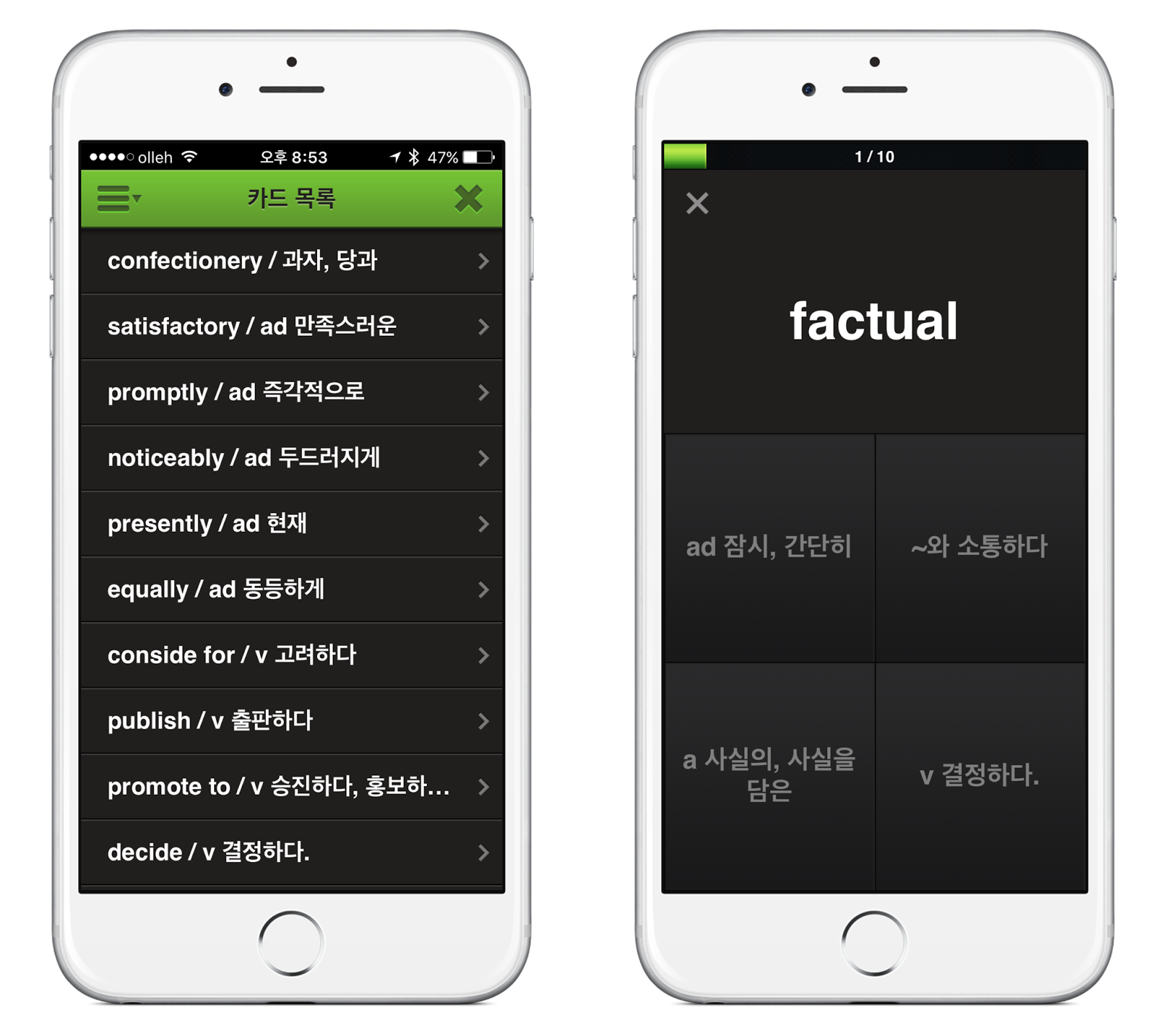 가볍게 게임으로 언어를 배워볼 수도 있고, 암기 학습법에 따라서 빨리 외운 단어는 덜 노출시키고 외우기 힘든 단어를 더 자주 띄워주는 똑똑한 기능도 가지고 있습니다.
