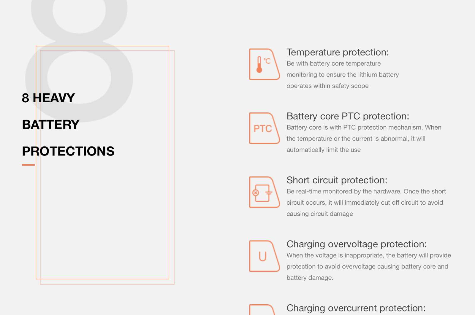 그리고 과전류 보호 및 역회전 방지, 단락 보호, 배터리 보호, 온도 보호 등등 다양한 보호 사양 및 8가지 안전 기술을 통해서 안전한 사용이 가능하다는 점도 강조하고 있습니다.
