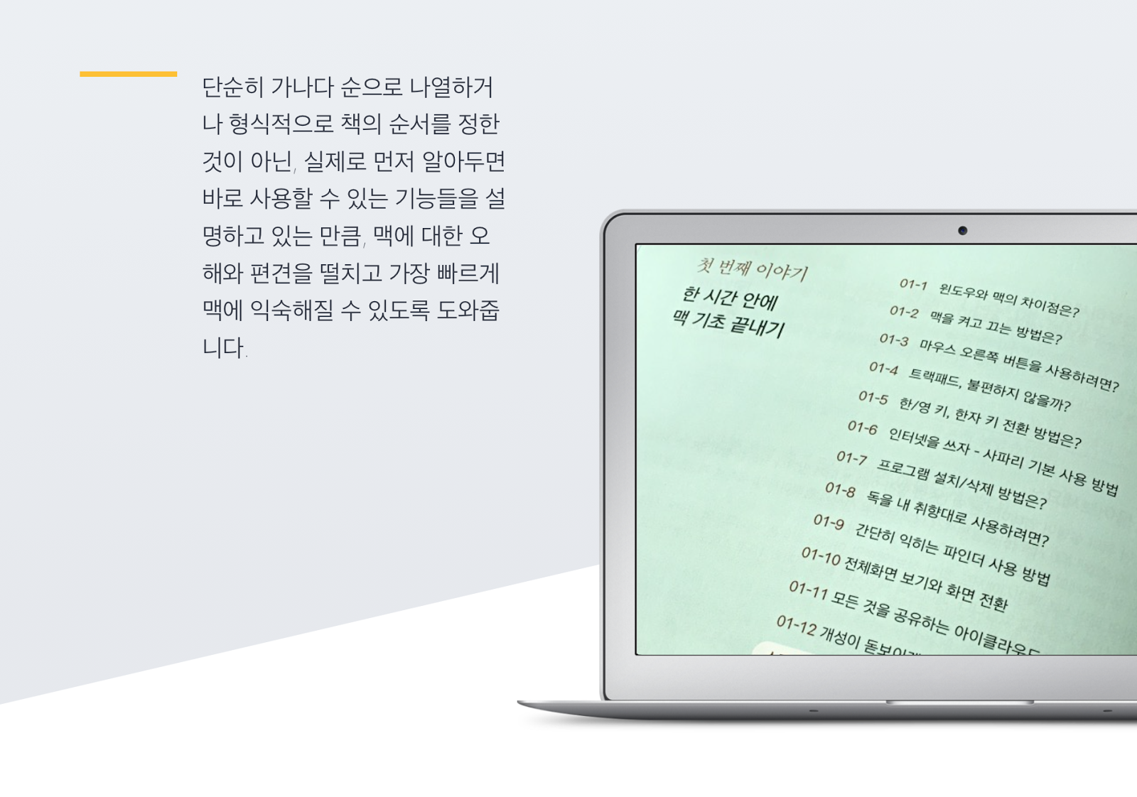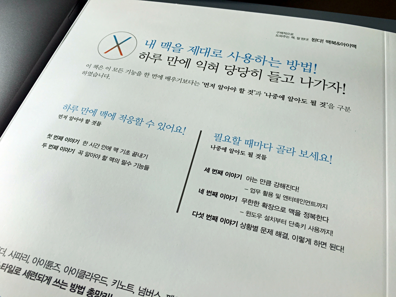 단순히 가나다 순으로 나열하거나 형식적으로 책의 순서를 정한 것이 아닌, 실제로 먼저 알아두면 바로 사용할 수 있는 기능들을 설명하고 있는 만큼, 맥에 대한 오해와 편견을 떨치고 가장 빠르게 맥에 익숙해질 수 있도록 도와줍니다.