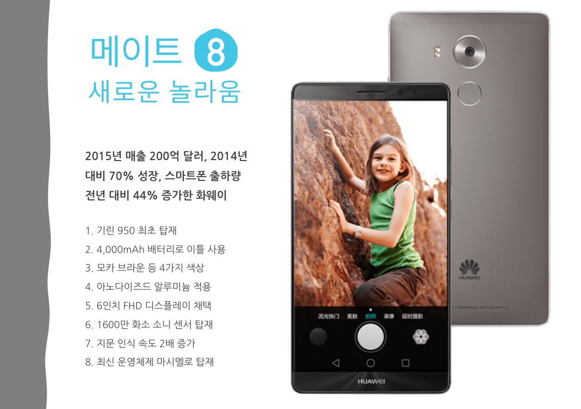 그 가운데서도 이슈가 되는 기업은 역시 화웨이였습니다. 가장 친밀한 IT 제품이라고 볼 수 있는 스마트폰을 새롭게 선보였기 때문인데, 그 면면을 보자면 메이트8이라는 이름에서처럼 8가지 놀라움을 가득 담은 제품이었습니다.