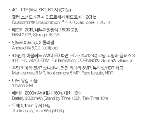 여기에 퀄컵 스냅드래곤 410 쿼드코어 프로세서와 2기가 램, 16기가 메모리를 갖추고 있으며 안드로이드 5.0.2 롤리팝을 기본으로 탑재하고 있습니다. 디스플레이 해상도는 HD로서 일상에서 사용해도 괜찮은 무난한 수준입니다.