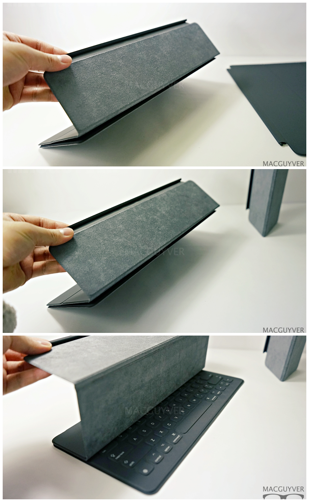 하지만 단점이라면 아이패드 프로와만 연결이 가능하다는 점, 또한 아이패드 프로와 연결한 이후 거치대 모양으로 세워야만 타이핑이 가능하다는 점입니다. 이로 인해서 스마트 키보드와 연결하더라도 펼쳐진 상태에서는 타이핑이 되지 않습니다 ▼