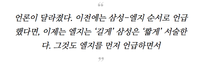 결과적으로 엘지는 과감한 변신과 혁신을 추구했고, 그 결과는 충분히 납득이 갔다. 하지만 안정적인 변화를 추구한 삼성전자는 스스로의 한계를 보여주고 말았다는 평가가 많다. 이미 높아질 대로 높아진 스펙은 더 이상 감흥을 주지 못하기 때문이다.