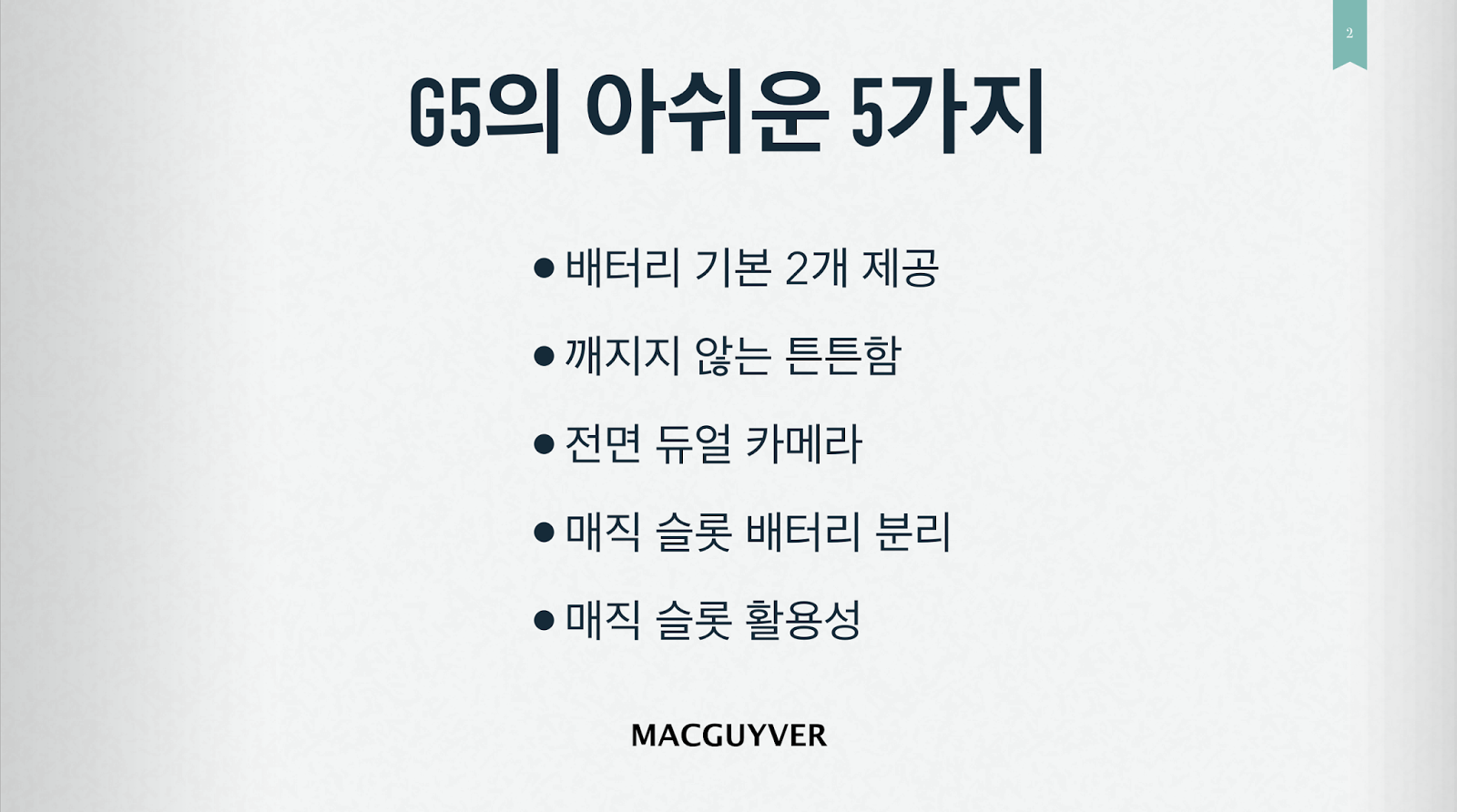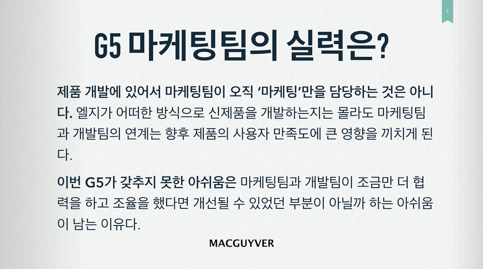 과장 광고가 아닌 G5가 가진, 진짜 있는 그대로의 매력을 소비자가 느낄 수 있도록 제대로 된 마케팅을 진행할 것을 기대해봐야겠다. 언제나 그렇듯, 아쉬움이 없는 제품은 없기 때문이다. - MACGUYVER.