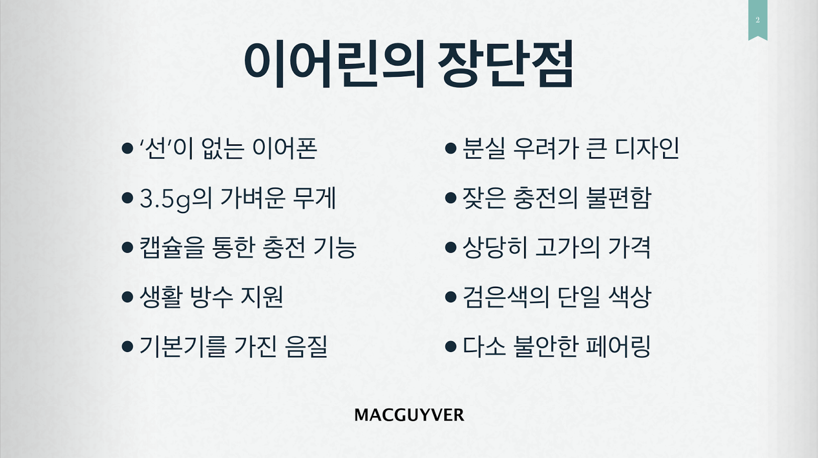 또한 연속 재생 시간이 짧다는 점, 충전에 75분이 걸리고 충전하면서 들을 수 없다는 점. 자체적인 디자인의 한계로 인해서 분실하기 쉽고 한 쪽만 잊어버려도 사용에 상당한 제약이 많다는 점을 알아둬야 한다.