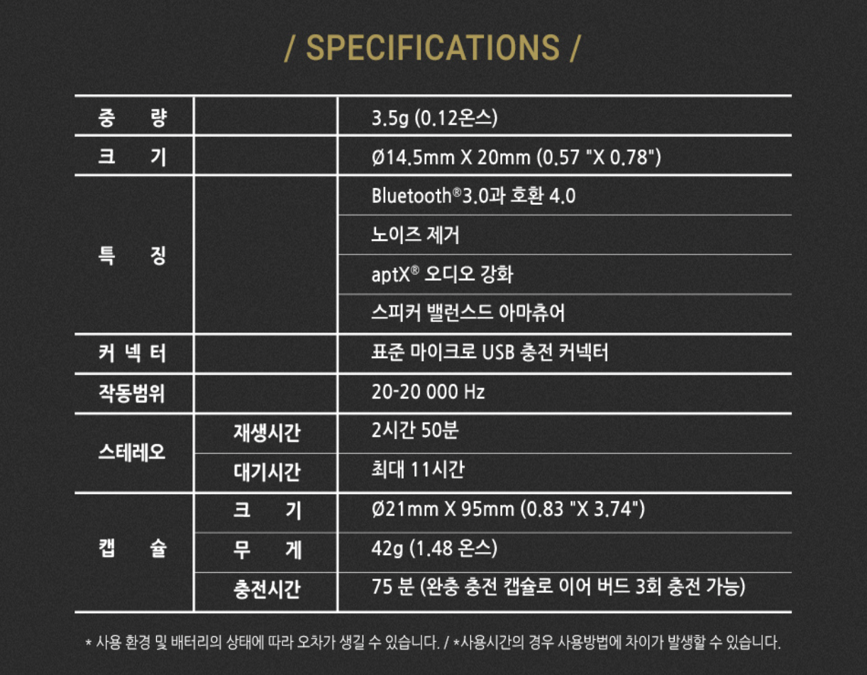 하지만 이러한 경량화를 추구하면서도 동시에 블루투스 이어폰으로서 기본적으로 갖춰야 하는 기본기도 놓치지 않았다. 이를테면 ‘음질’이 있다. Apt-x로 불리는 기술을 통해서 높은 효율로 압축 전송되는 고음질을 경험하게 해주는 것.