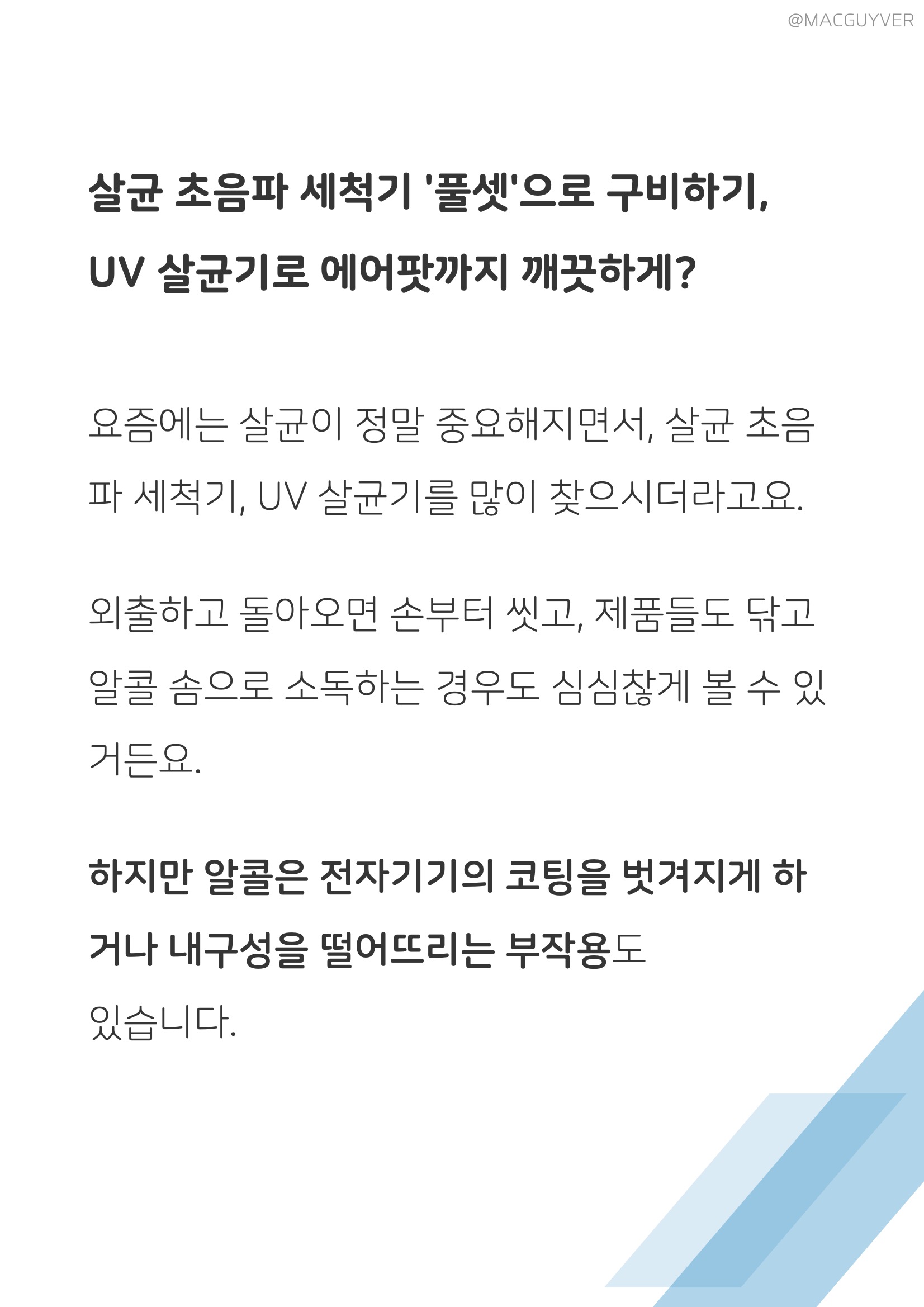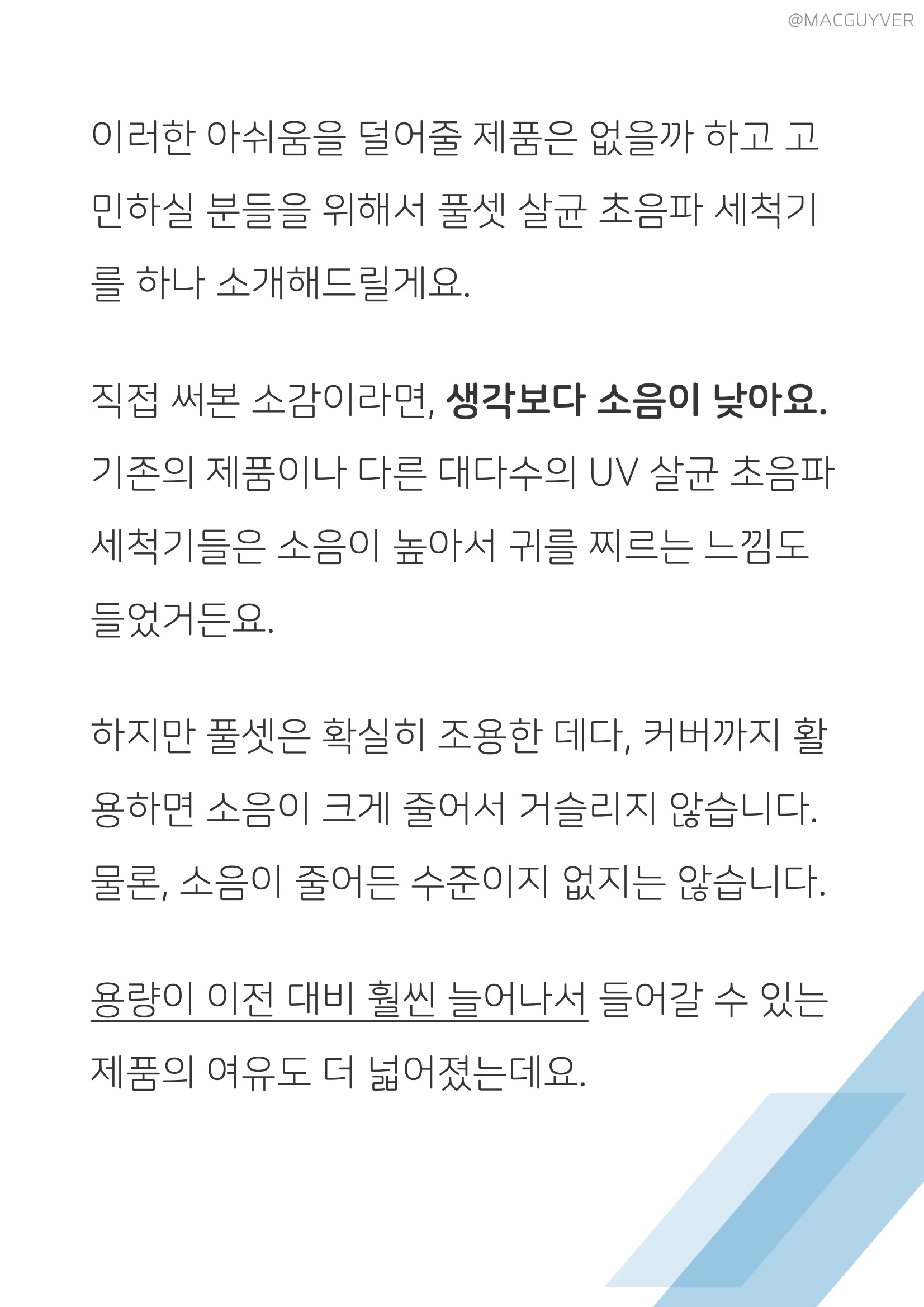 요즘에는 살균이 정말 중요해지면서, 살균 초음파 세척기, UV 살균기를 많이 찾으시더라고요. 외출하고 돌아오면 손부터 씻고, 제품들도 닦고 에어팟 소독 마스크 소독 알콜 솜으로 소독하는 경우도 심심찮게 볼 수 있거든요. 하지만 알콜은 전자기기의 코팅을 벗겨지게 하거나 내구성을 떨어뜨리는 부작용도 있습니다. 이러한 아쉬움을 덜어줄 제품은 없을까 하고 고민하실 분들을 위해서 풀셋 살균 초음파 세척기를 하나 소개해드릴게요. 초음파 세척기 직접 써본 소감이라면, 생각보다 소음이 낮아요. 기존의 제품이나 다른 대다수의 UV 살균 초음파 세척기들은 소음이 높아서 귀를 찌르는 느낌도 들었거든요. 하지만 풀셋은 확실히 조용한 데다, 풀셋 초음파 세척기 커버까지 활용하면 소음이 크게 줄어서 거슬리지 않았습니다. 물론, 소음이 줄어든 수준이지 없지는 않습니다.