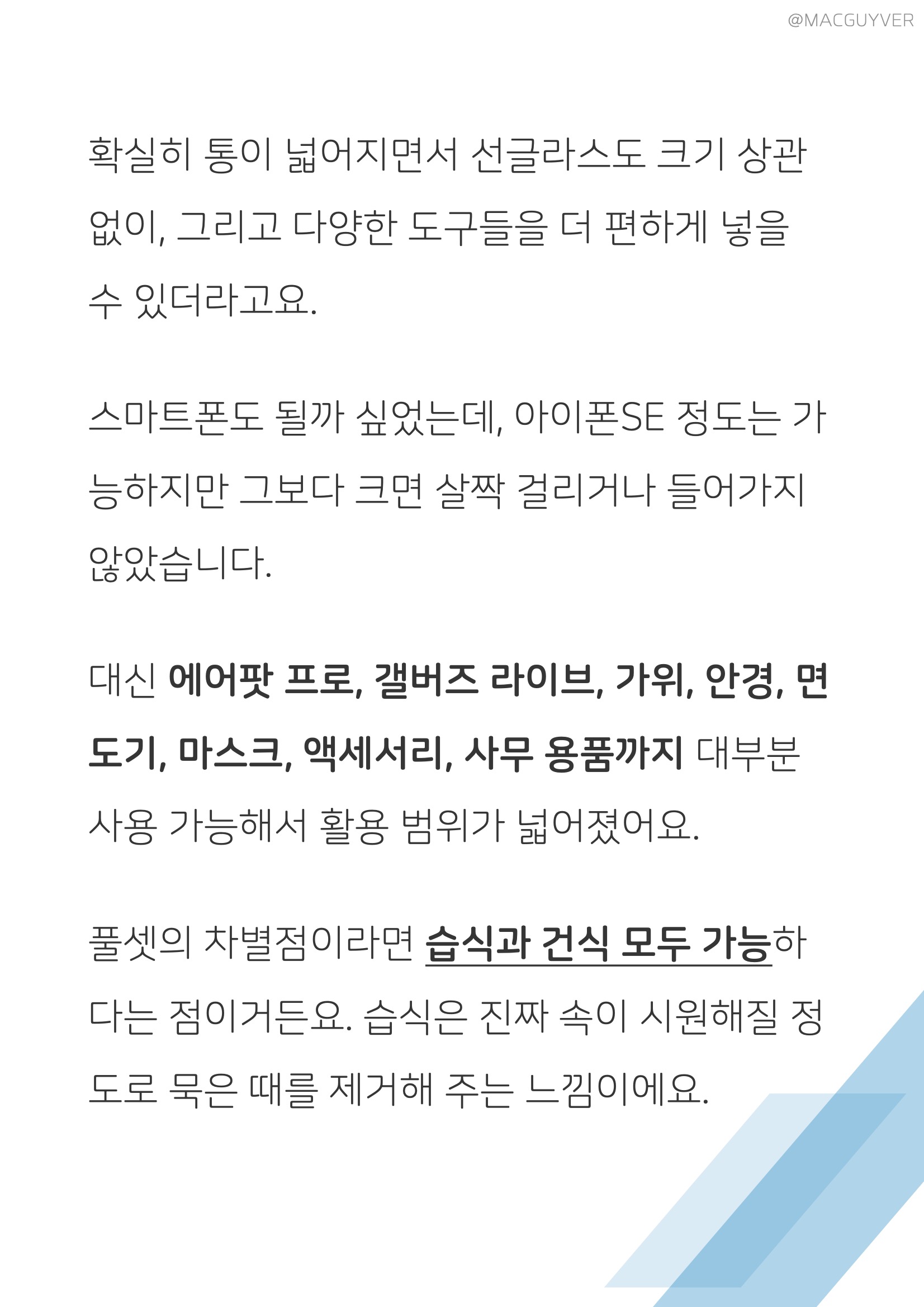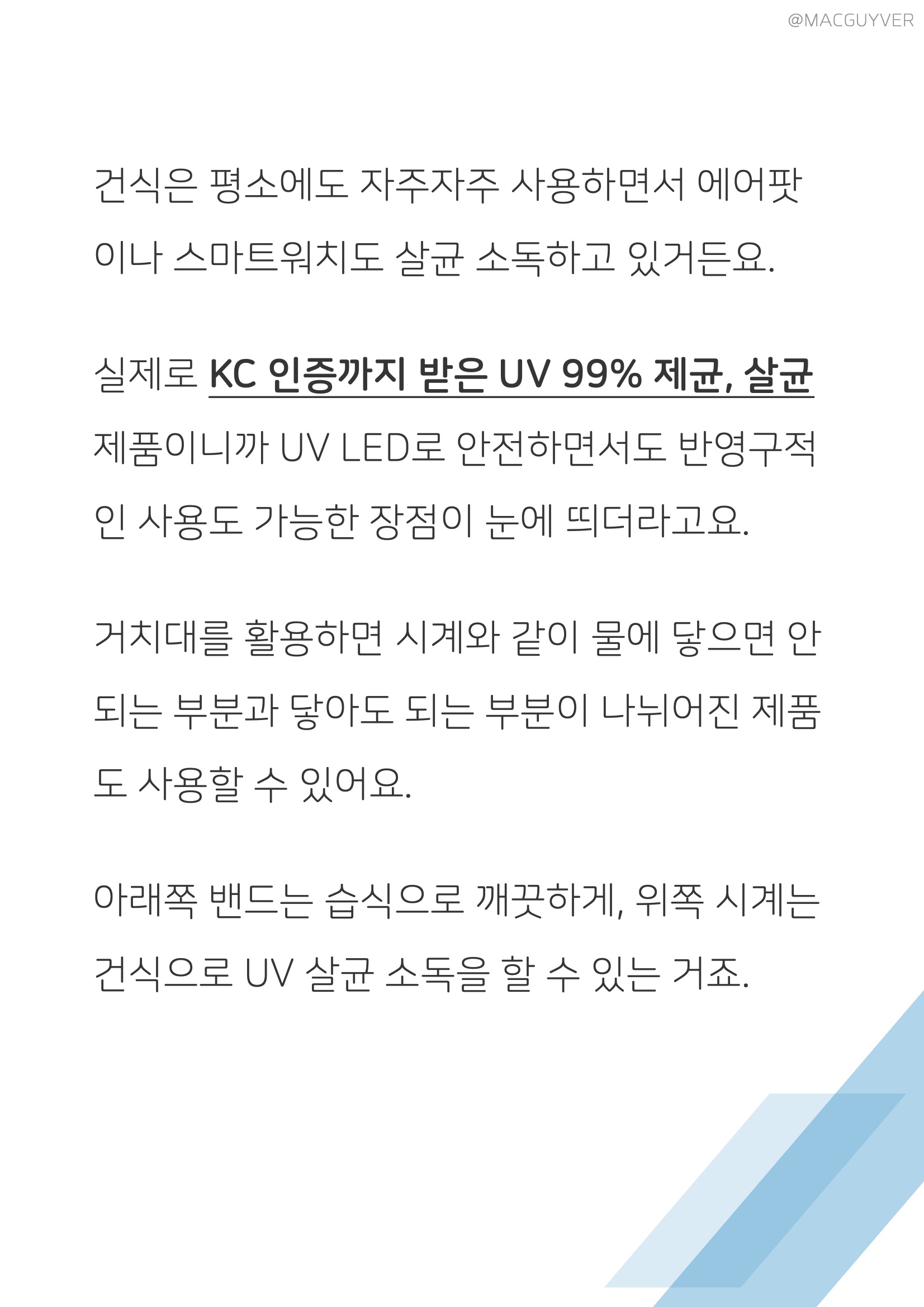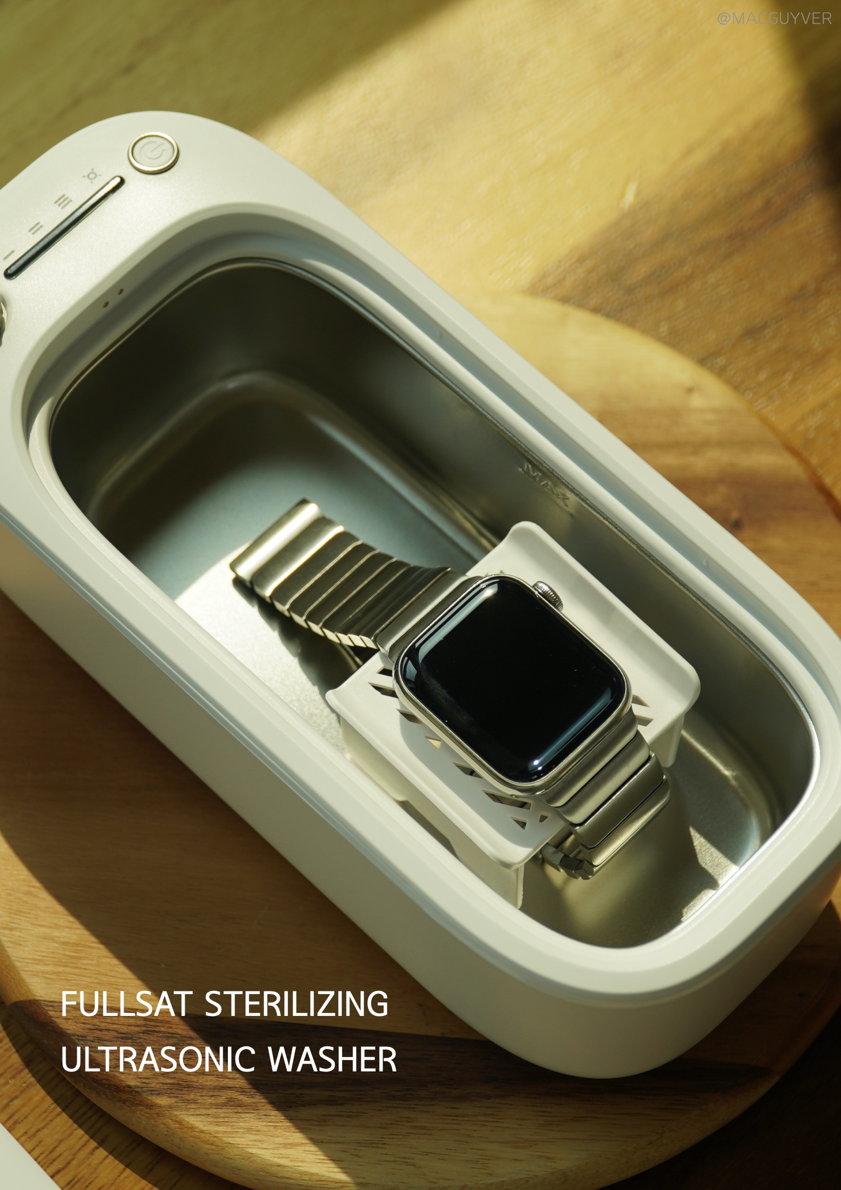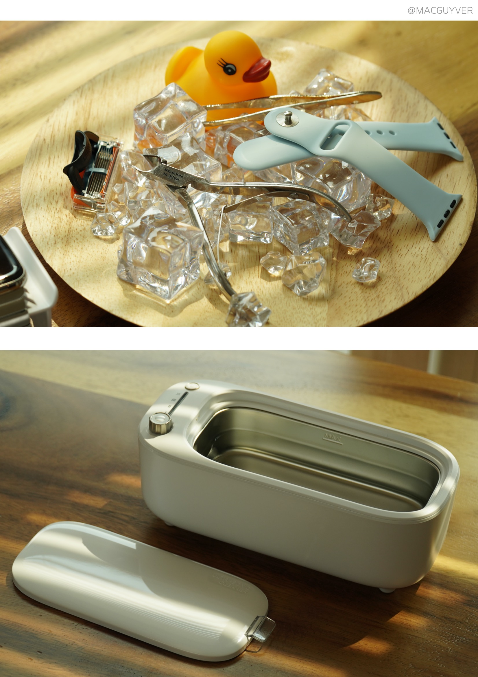 UV 살균기 용량이 이전 대비 훨씬 늘어나서 들어갈 수 있는 제품의 여유도 더 넓어졌는데요. 확실히 살균 초음파 세척기 통이 넓어지면서 선글라스도 크기 상관없이, 그리고 다양한 도구들을 더 편하게 넣을 수 있더라고요. 스마트폰도 될까 싶었는데, 아이폰SE 정도는 가능하지만 그보다 크면 살짝 걸리거나 들어가지 않았습니다. 대신 에어팟 프로, 갤버즈 라이브, 가위, 안경, 면도기, 마스크, 액세서리, 에어팟 소독, 마스크 소독, 사무 용품까지 대부분 호환이 가능해서 활용 범위가 넓어졌어요. 풀셋 살균 초음파 세척기의 차별점이라면 습식과 건식 모두 가능하다는 점이거든요. 습식은 진짜 속이 시원해질 정도로 묵은 때를 제거해 주는 느낌이에요. 건식은 평소에도 자주자주 사용하면서 에어팟이나 스마트워치도 살균 소독하고 있거든요. 실제로 KC 인증까지 받은 UV 99% 제균, 살균 제품이니까 UV LED로 안전하면서도 반영구적인 사용도 가능한 장점이 눈에 띄더라고요. UV 살균기 추가 부품에 대해서도 간략히 소개를 드리자면, 시계와 같이 물에 닿으면 안 되는 부분과 닿아도 되는 부분이 나뉘어진 제품을 활용할 수 있어요. 풀셋 살균 초음파 세척기 아래쪽 밴드는 습식으로 깨끗하게, 위쪽 시계는 건식으로 UV 살균 소독을 할 수 있는 거죠.
