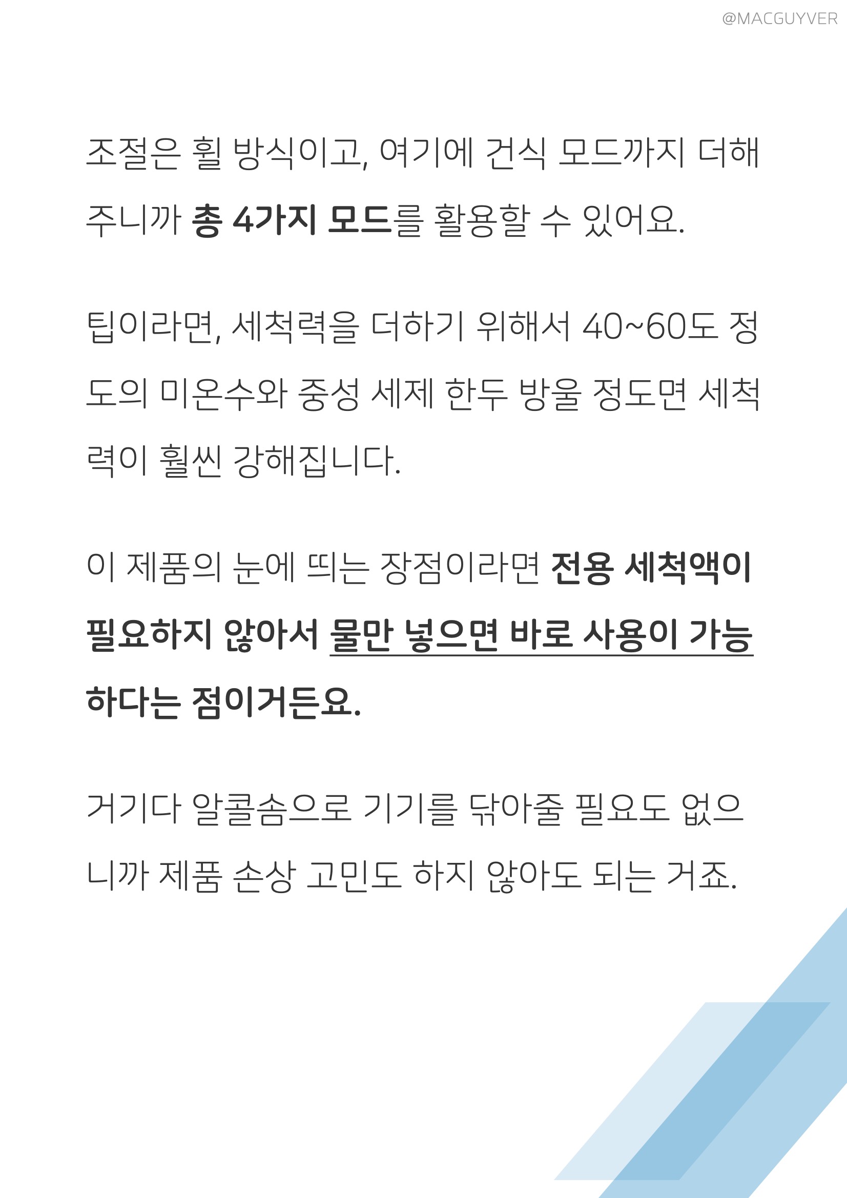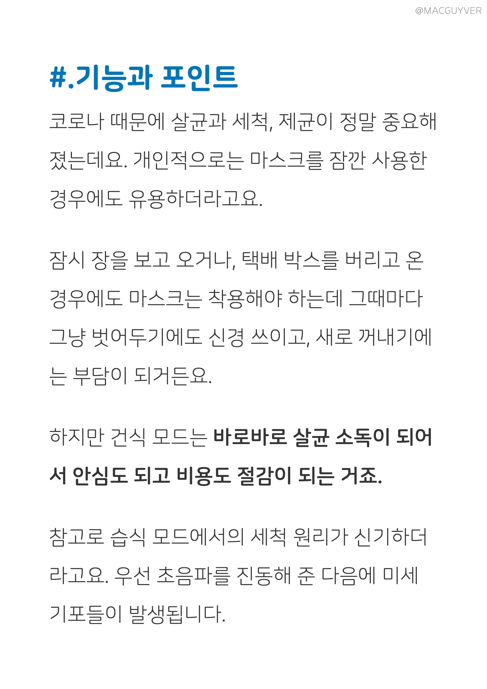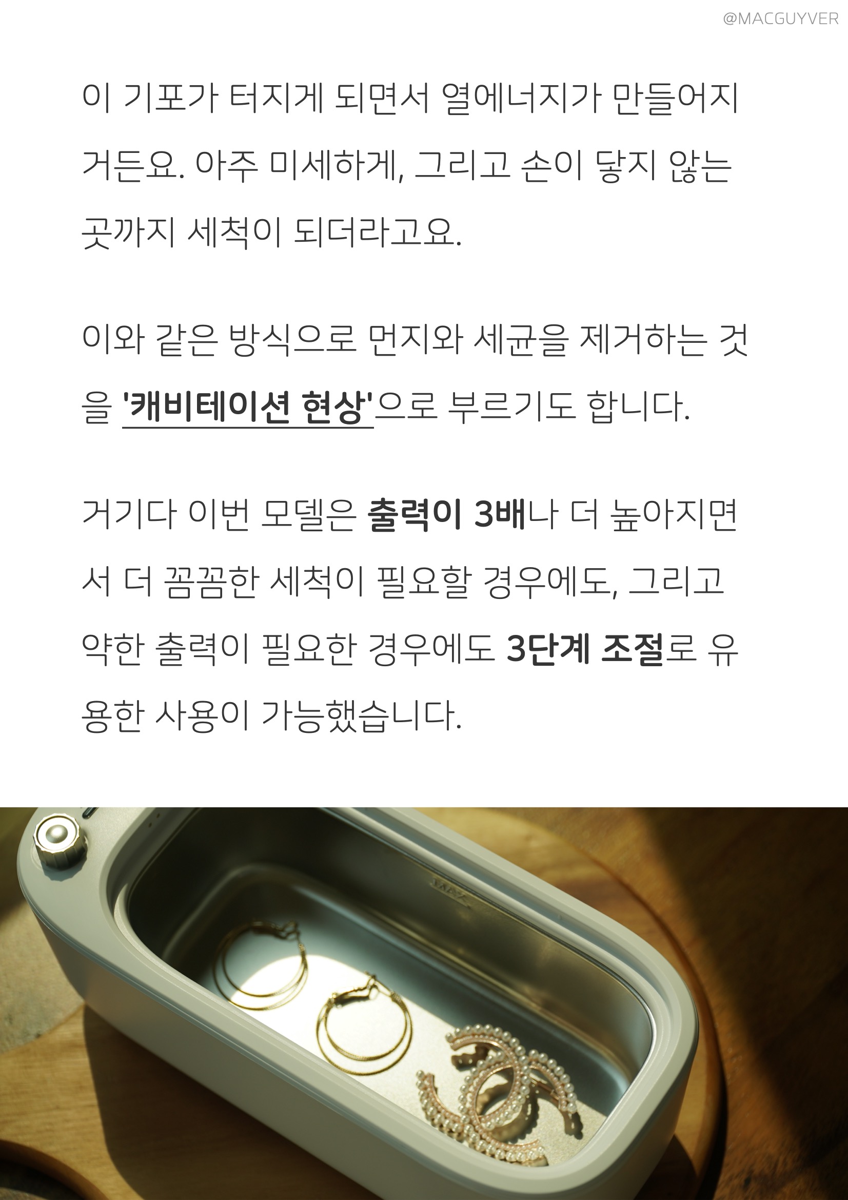 #. 초음파 세척기 기능과 포인트 코로나 때문에 살균과 세척, 제균이 정말 중요해졌는데요. 개인적으로는 마스크를 잠깐 사용한 경우에도 유용하더라고요. 잠시 장을 보고 오거나, 택배 박스를 버리고 온 경우에도 마스크는 착용해야 하는데 그때마다 그냥 벗어두기에도 신경 쓰이고, 새로 꺼내기에는 부담이 되거든요. 하지만 건식 모드를 활용해보니까 바로바로 살균 소독이 되어서 안심도 되고 비용도 절감이 되는 거죠. 참고로 습식 모드에서의 세척 원리가 신기하더라고요. 우선 풀셋 초음파 세척기 초음파를 진동해 준 다음에 미세 기포들이 발생됩니다. 이 기포가 터지게 되면서 열에너지가 만들어지거든요. 이러한 방식으로 아주 미세하게, 그리고 손이 닿지 않는 곳까지 세척이 되더라고요. 이러한 먼지와 세균을 제거하는 것을 '캐비테이션 현상'으로 부르기도 합니다. 거기다 풀셋 살균 초음파 세척기 이번 모델은 출력이 3배나 더 높아지면서 더 꼼꼼한 세척이 필요할 경우에도, 그리고 약한 출력이 필요한 경우에도 3단계 조절로 유용한 사용이 가능했습니다. 조절은 휠 방식이고, 여기에 건식 모드까지 더해주니까 총 4가지 모드를 활용할 수 있어요.
