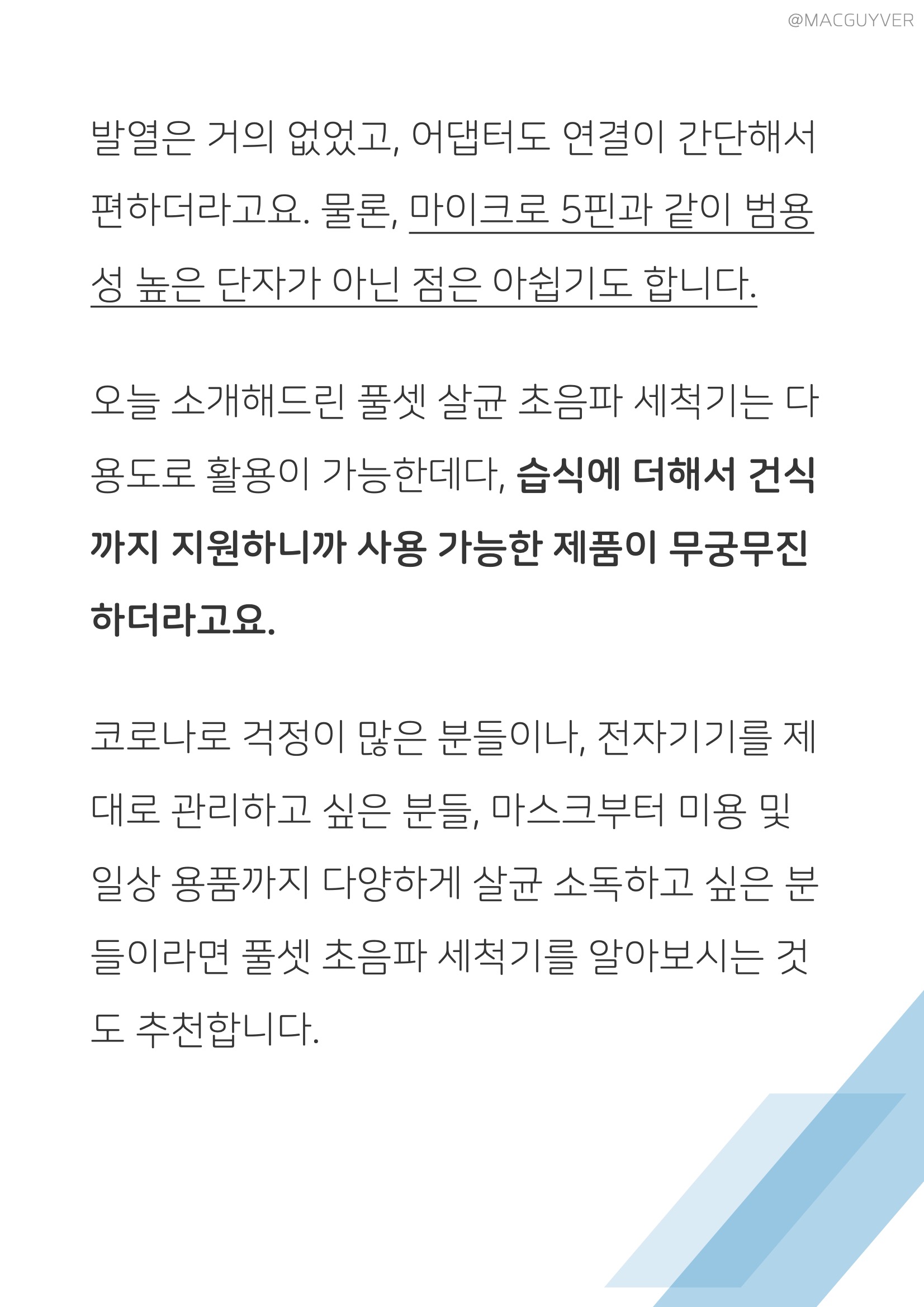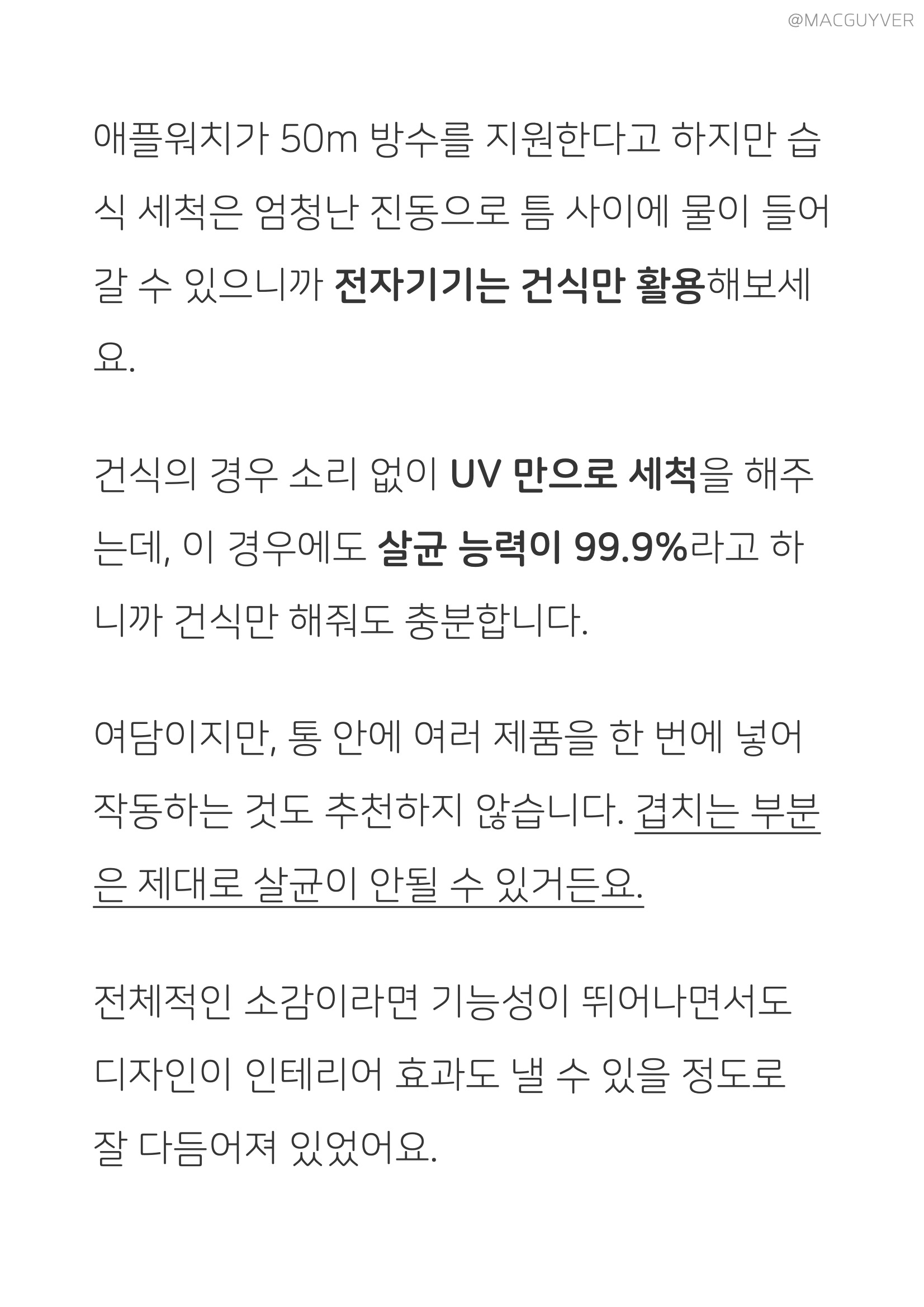 애플워치가 50m 방수를 지원한다고 하지만 습식 세척은 엄청난 진동으로 틈 사이로 물이 들어갈 수 있으니까 전자기기는 건식만 활용해보세요. 풀셋 초음파 세척기 건식의 경우는 소리 없이 UV 만으로 세척을 해주는데, 이 경우에도 살균 능력이 99.9%라고 하니까 걱정하지 말고 건식만 해줘도 충분합니다. 풀셋 살균 초음파 세척기 여담이지만, 통 안에 가능한 많은 도구들을 한 번에 넣어서 작동하는 것도 추천하지 않습니다. 살균 초음파 세척기 겹치는 부분에는 제대로 살균이 안될 수 있거든요. 전체적인 소감이라면 기능성이 뛰어나면서도 디자인이 인테리어 효과도 낼 수 있을 정도로 잘 다듬어져 있었어요. 발열은 거의 없었고, 어댑터도 연결이 간단해서 편하더라고요. 물론, 마이크로 5핀과 같이 범용성 높은 단자가 아닌 점은 아쉽기도 합니다. 오늘 소개해드린 UV 살균기, 풀셋 살균 초음파 세척기는 다용도로 활용이 가능한데다, 습식에 더해서 건식까지 지원하니까 사용 가능한 제품이 무궁무진하더라고요. 코로나로 걱정이 많은 분들이나, 전자기기를 제대로 관리하고 싶은 분들, 에어팟 소독, 마스크부터 미용 및 일상 용품까지 다양하게 살균 소독하고 싶은 분들이라면 풀셋 초음파 세척기를 알아보시는 것도 추천합니다.