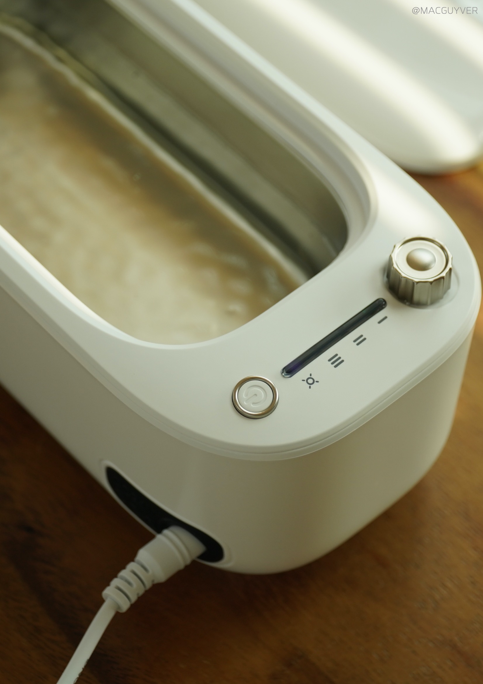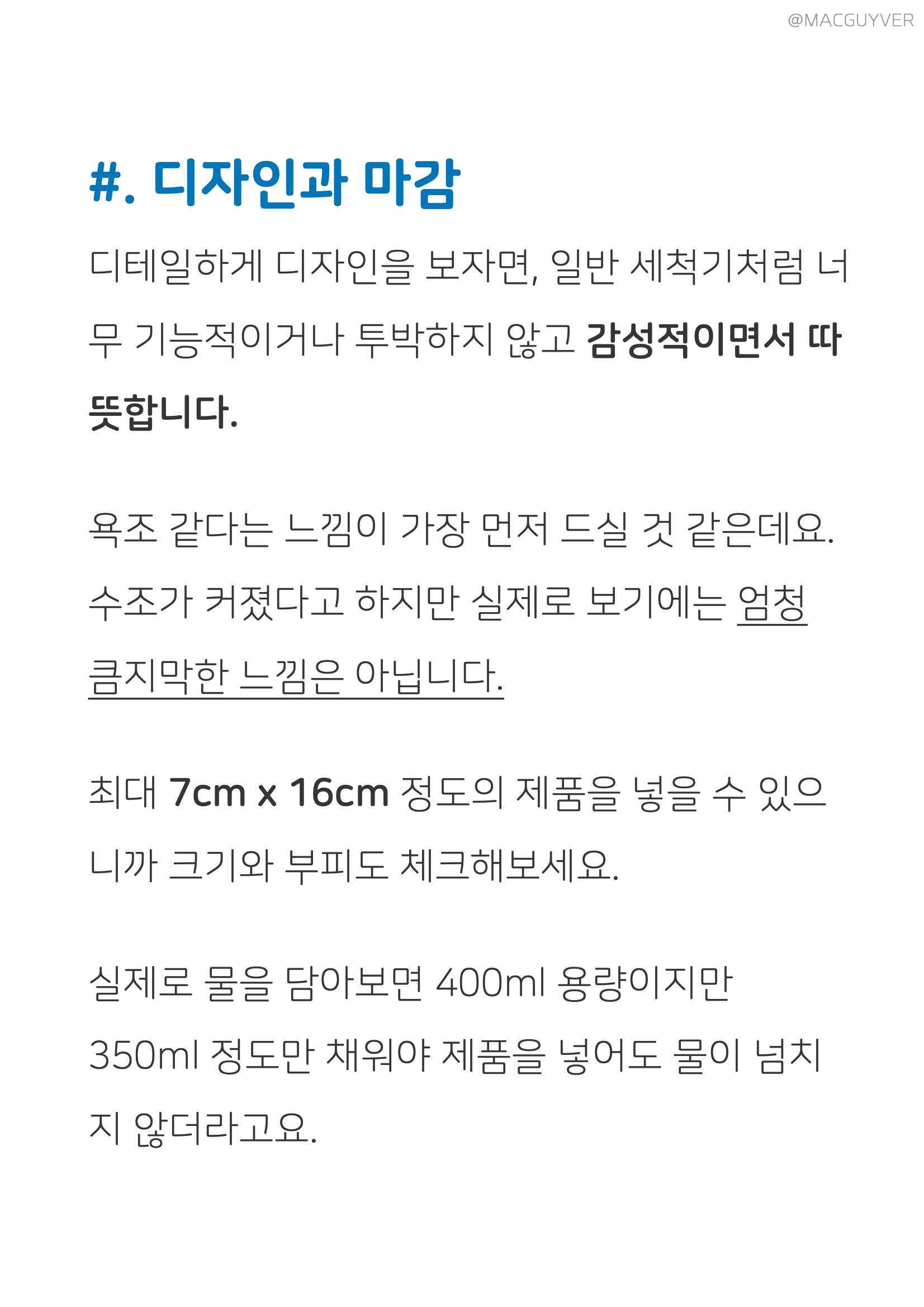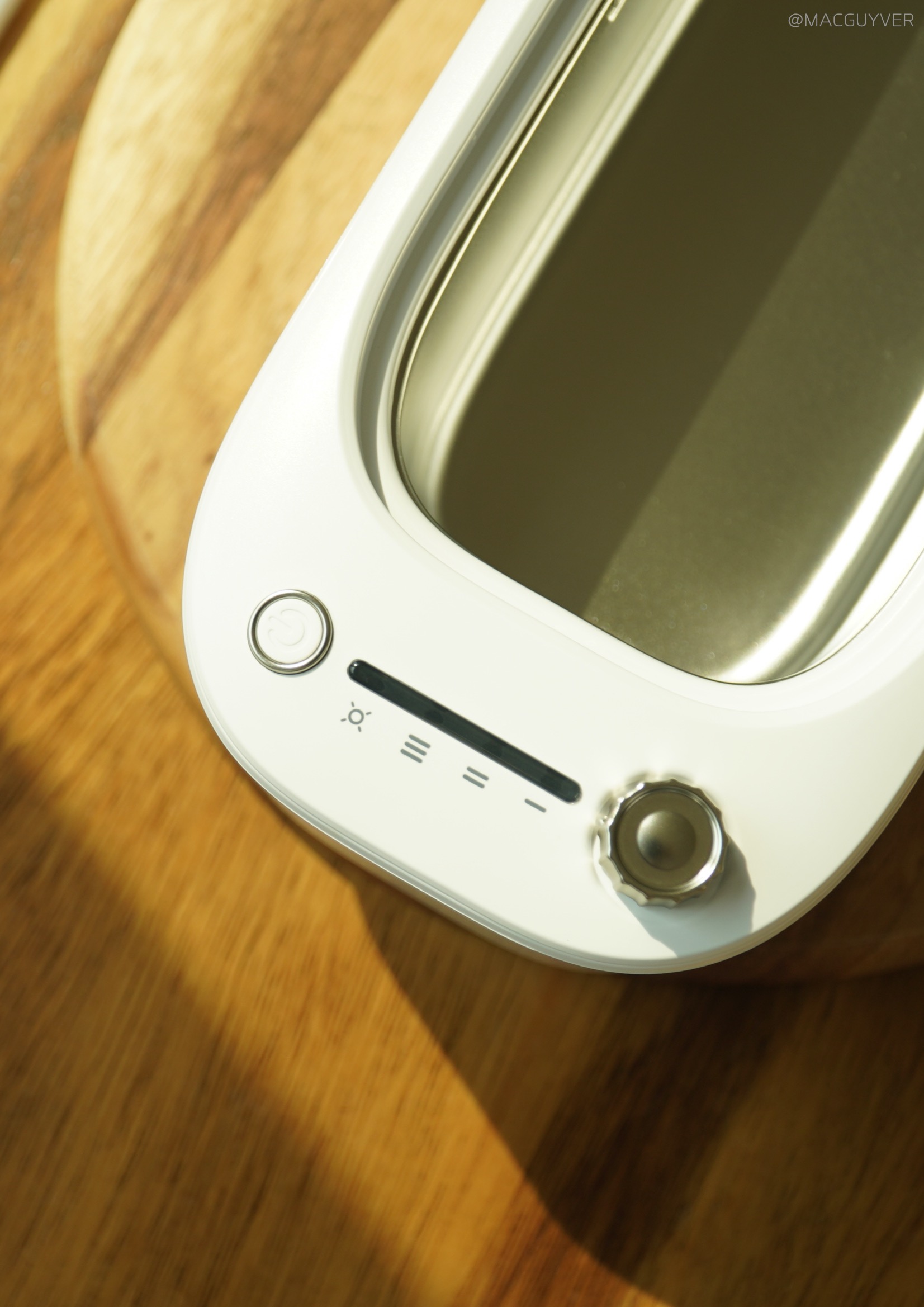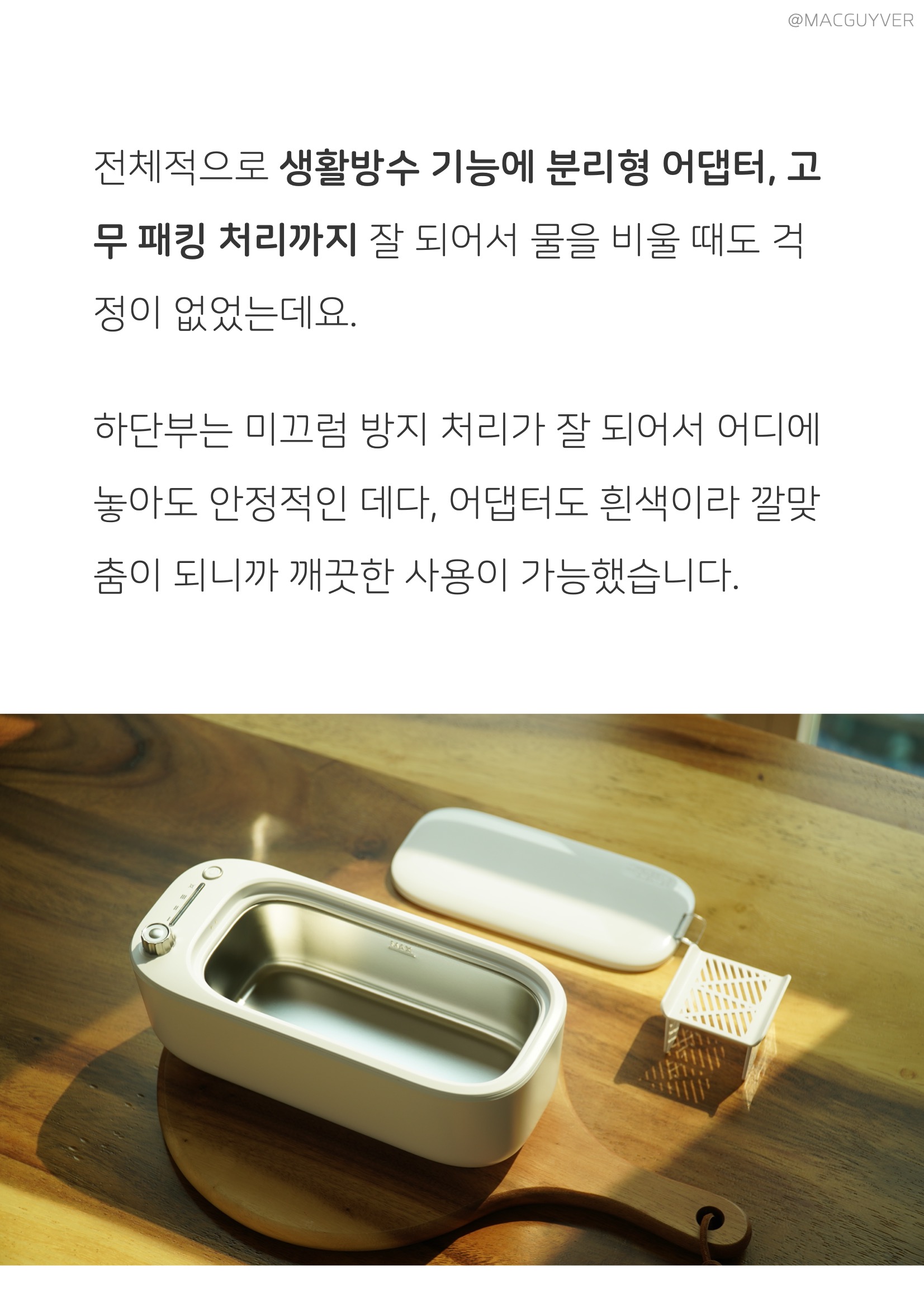 #.UV 살균기 디자인과 마감 디테일하게 디자인을 보자면, 일반 세척기처럼 너무 기능적이거나 투박하지 않고 감성적이면서 따뜻합니다. 욕조 같다는 느낌이 가장 먼저 드실 것 같은데요. 수조가 커졌다고 하지만 실제로 보기에는 엄청 큼지막한 느낌은 아닙니다. 최대 7cm x 16cm 정도의 제품을 넣을 수 있으니까 크기와 부피도 체크해보세요. 실제로 물을 담아보면 400ml 용량이지만 350ml 정도만 채워야 제품을 넣어도 물이 넘치지 않더라고요. 전체적으로 살균 초음파 세척기 생활방수 기능에 분리형 어댑터, 고무 패킹 처리까지 잘 되어서 물을 비울 때도 걱정이 없었는데요. 풀셋 초음파 세척기 하단부는 미끄럼 방지 처리가 잘 되어서 어디에 놓아도 안정적인 데다, 어댑터도 흰색이라 깔맞춤이 되니까 깨끗한 사용이 가능했습니다.