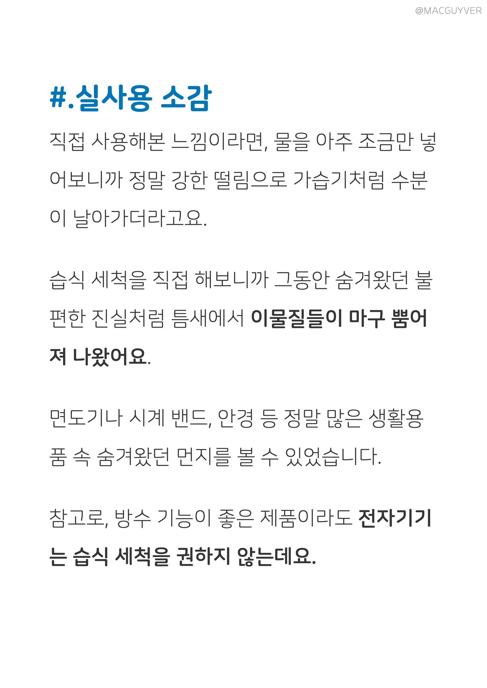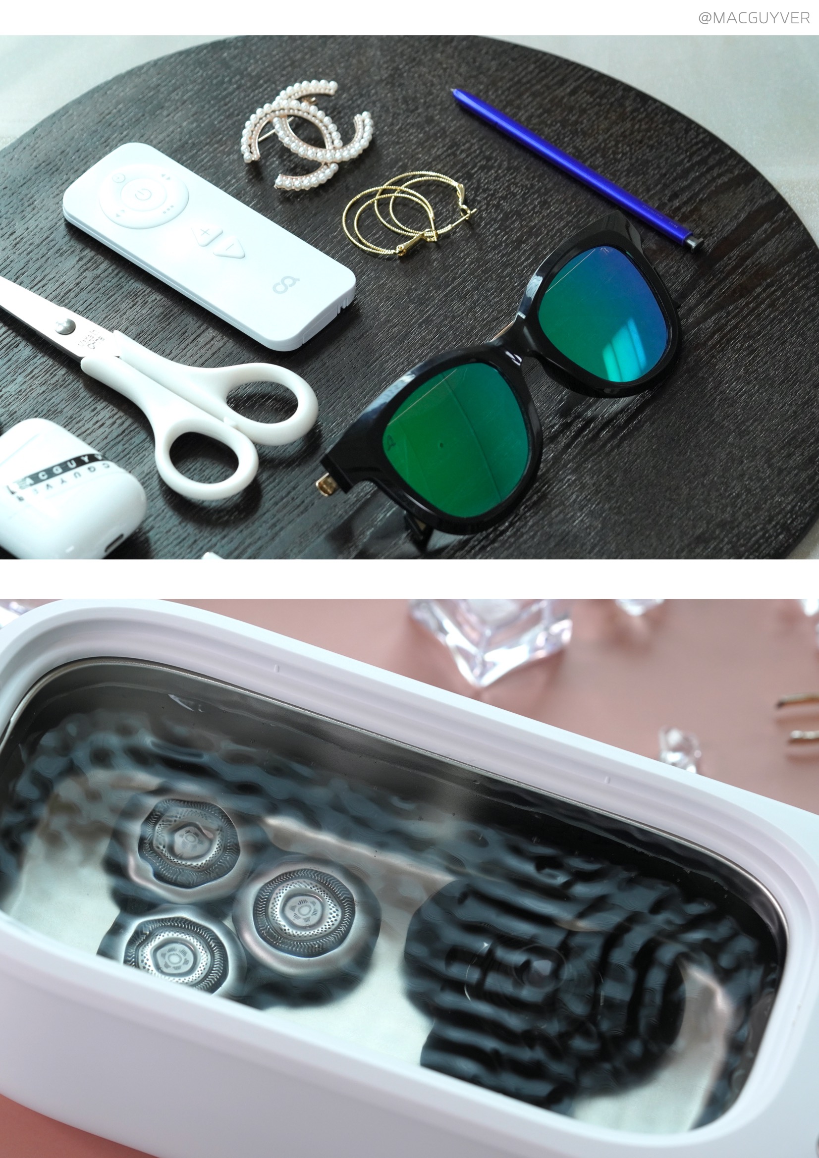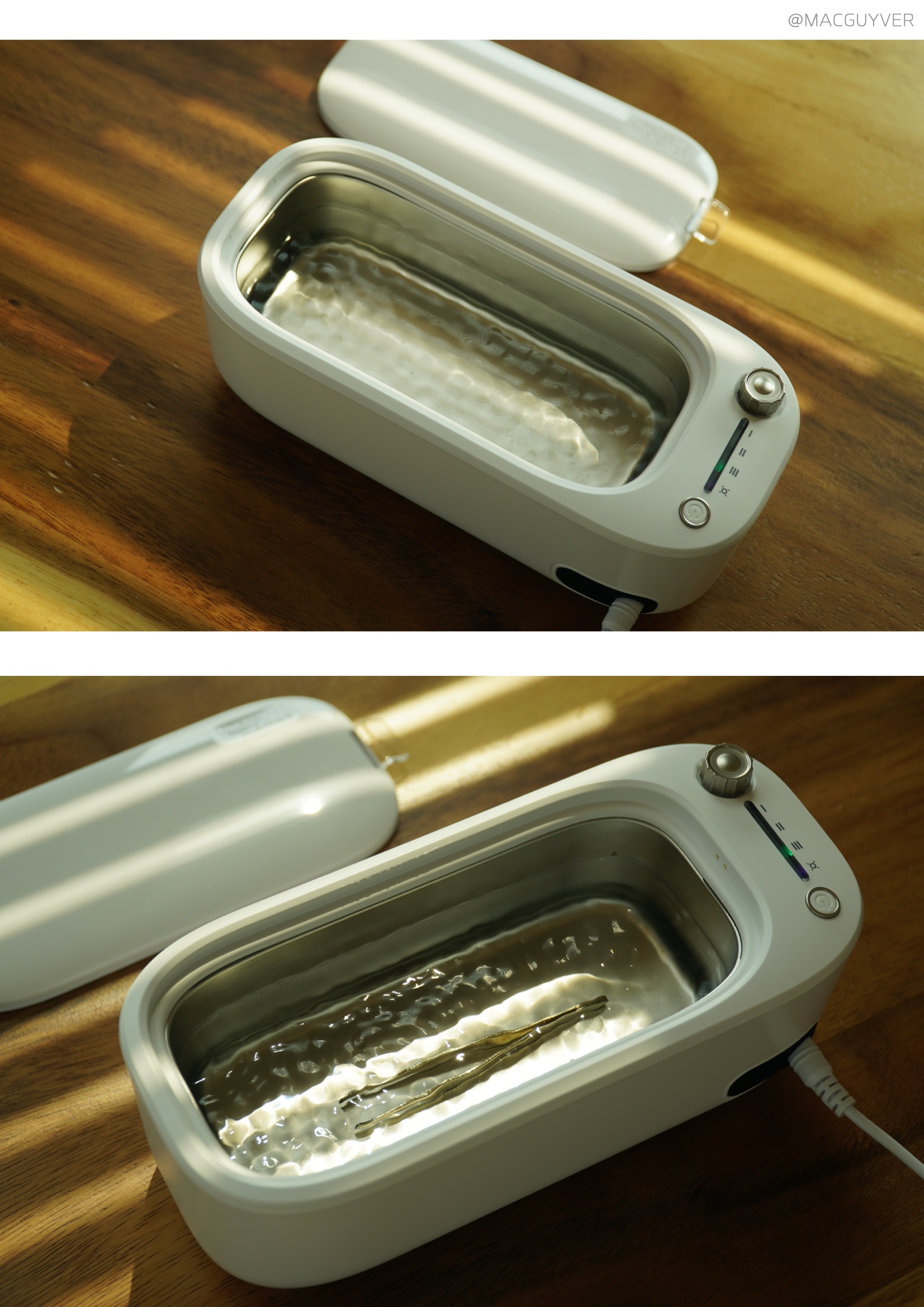 풀셋 초음파 세척기 팁이라면, 세척력을 더하기 위해서 40~60도 정도의 미온수와 중성 세제 한두 방울 정도면 세척력이 훨씬 강해집니다. 풀셋 살균 초음파 세척기 눈에 띄는 장점이라면 전용 세척액이 필요하지 않아서 물만 넣으면 바로 사용이 가능하다는 점이거든요. 거기다 알콜솜으로 기기를 닦아줄 필요도 없으니까 제품 손상 고민도 하지 않아도 되는 거죠. #. 초음파 세척기 실사용 소감 직접 사용해본 느낌이라면, 물을 아주 조금만 넣어보니까 정말 강한 떨림으로 가습기처럼 수분이 날아가더라고요. 습식 세척을 직접 해보니까 그동안 숨겨왔던 불편한 진실처럼 틈새에서 이물질들이 마구 뿜어져 나왔어요. 면도기나 시계 밴드, 안경 등등 정말 많은 도구들에서 숨겨왔던 먼지를 볼 수 있었습니다. 참고로, 살균 초음파 세척기 방수 기능이 좋은 제품이라도 전자기기는 습식 세척을 권하지 않는데요.