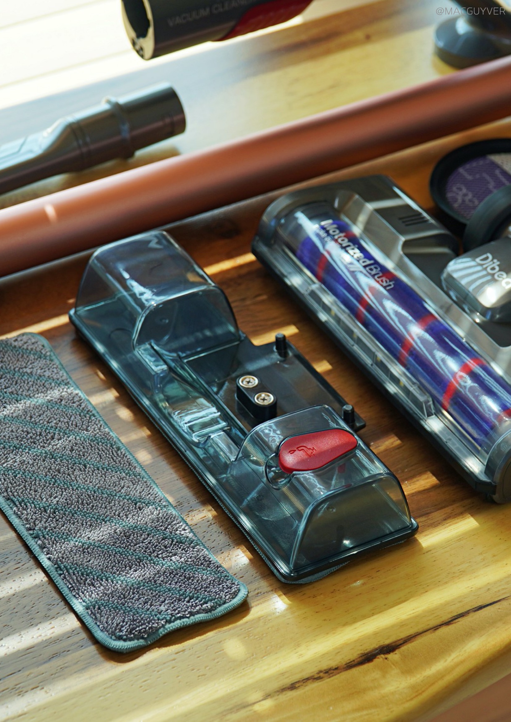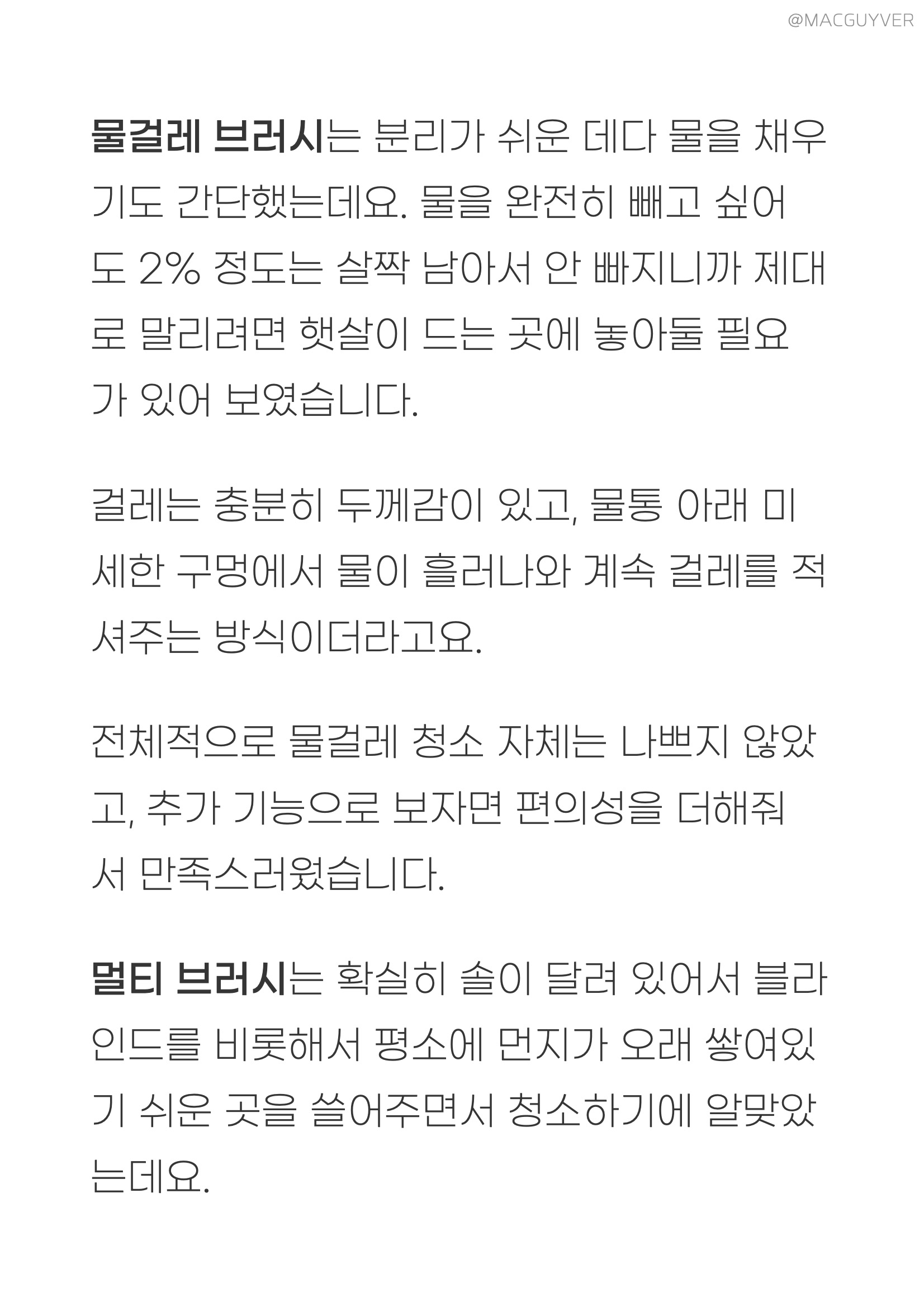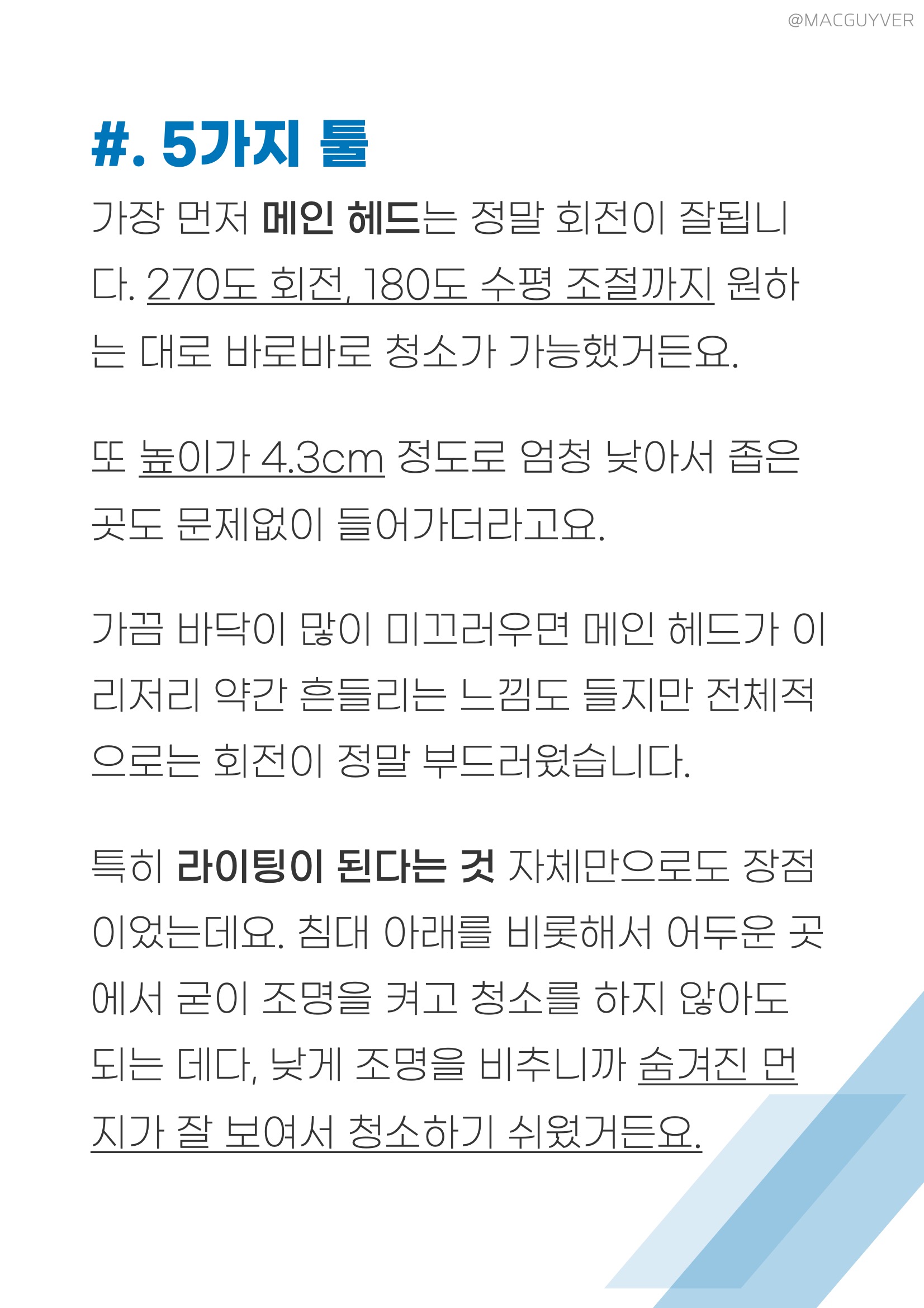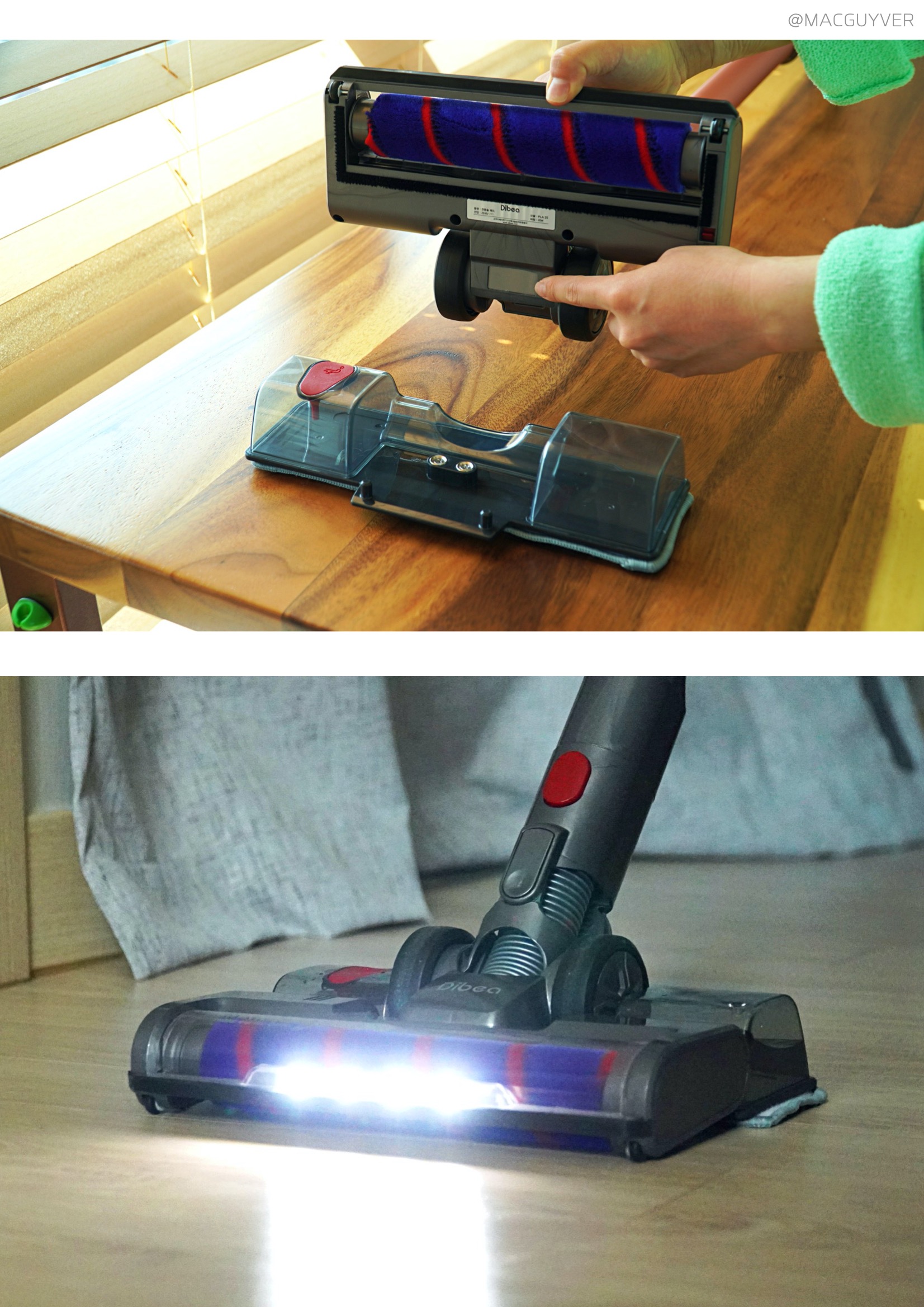 무선청소기추천 #. 5가지 툴 가장 먼저 메인 헤드는 정말 회전이 잘됩니다. 270도 회전에 180도 수평 조절까지 되니까 원하는 대로 바로바로 청소가 가능했거든요. 또 높이가 4.3cm 정도로 다른 청소기의 헤드 대비 엄청 낮아서 좁은 곳도 문제없이 들어가더라고요. 가끔 바닥이 많이 미끄러우면 메인 헤드가 이리저리 약간 흔들리는 느낌도 들지만 전체적으로는 원할 때 회전이 정말 부드러워서 만족스러웠습니다.특히 라이팅이 된다는 것 자체만으로도 장점이었는데요. 침대 아래를 비롯해서 어두운 곳에서 굳이 조명을 켜고 청소를 하지 않아도 되는 데다, 낮게 조명을 비추니까 숨겨진 먼지가 잘 보여서 청소하기 쉬웠거든요. 이어서 2in1청소기 물걸레 브러시는 분리가 쉬운 데다 물을 채우기 쉽고 말리기도 간단했는데요. 2in1청소기 물을 완전히 빼고 싶어도 2% 정도는 살짝 남아서 안 빠지니까 제대로 말리려면 햇살이 드는 곳에 놓아둘 필요가 있어 보였습니다. 대신 디베아무선청소기 걸레는 충분히 두께감이 있고, 물통도 물을 채우기 쉬워서 사용이 간단했는데요. 아래쪽에 미세한 구멍이 있어서 계속 걸레를 적셔주는 방식이더라고요. 무선청소기추천 전체적으로 물걸레 청소 자체는 나쁘지 않았고, 차이슨청소기의 추가 기능으로 보자면 편의성을 더해줘서 만족스러웠습니다.