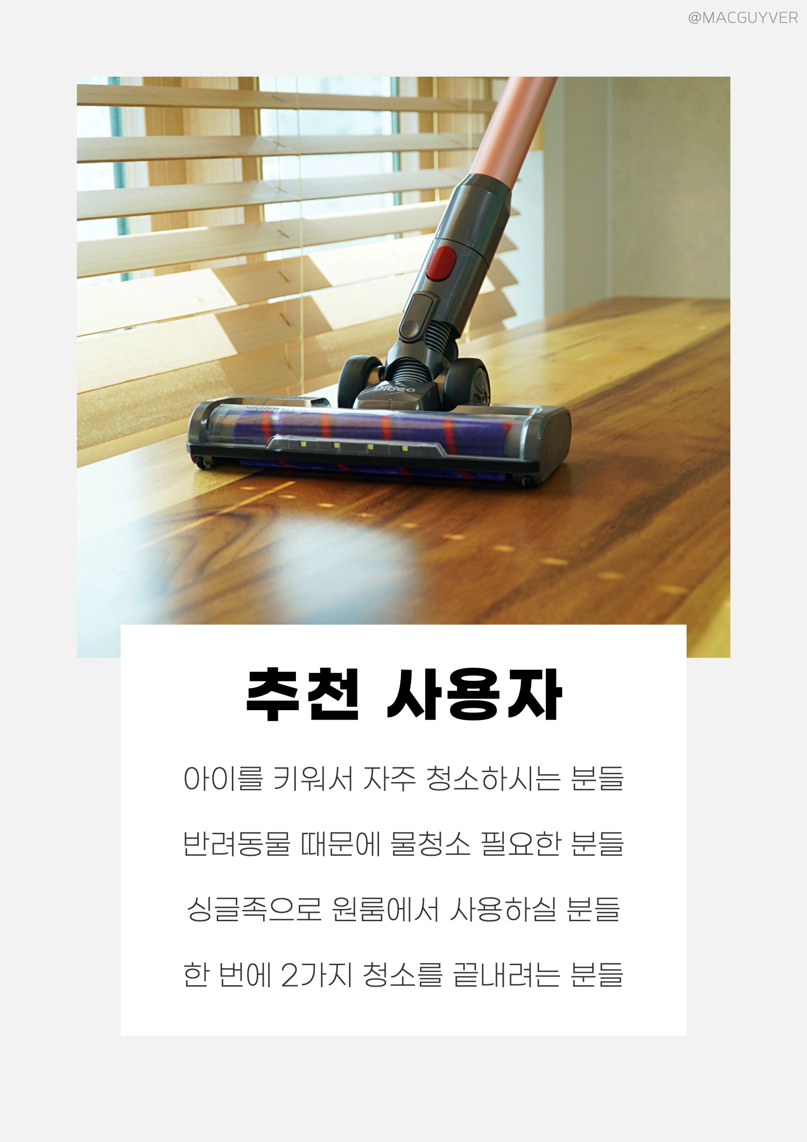무선청소기추천 확실히 디베아무선청소기 무선청소기 자체가 가볍고, 라이트가 들어오는 데다 헤드가 유연해서 장점이 되는 거죠. 추가적으로, 구조적인 장점을 놓치기 쉽지만, 침대 아래와 같이 낮고 깊은 곳을 청소할 때 차이슨청소기의 흡입구 위치가 아래라 만족스러웠거든요. 그러니까, 대부분은 먼지통 중앙에서 흡입구가 시작되다 보니까 낮은 곳을 청소할 때 다소 붕 떠있는 느낌인데요. 반면에 디베아무선청소기는 먼지통 아래에 위치해서 바닥과 더 가까우니까 낮은 곳을 청소할 때 편리하더라고요. 정리하자면, 디베아 차이슨 무선 청소기는 원룸을 청소하기에도 시간을 줄여주고 기기 크기가 작아서 공간을 절약해 주는데다 배터리팩만 분리해서 충전도 가능했습니다. 2in1청소기 또한 반려동물이 있어서 물걸레 청소가 필수적인 분들에게도 시간을 아껴주는 무선 청소기이기도 했는데요. 원룸청소기 아이가 있는 가족들이라면 더 자주 청소기를 사용하게 되는데, 2시간 급속 충전과 50분의 넉넉한 배터리 타임도 장점이 아닐까 싶었습니다. 앞서 소개 드린 것처럼, 인스타그램과 포스트 채널에서 진행되는 디베아무선청소기 3대 증정 이벤트도 있으니까 관심이 있으신 분들은 아래 배너를 통해서 가성비청소기 이벤트에 참여해보시기 바랍니다. 저렴한청소기 #. 차이슨청소기 추천 사용자 아이를 키워서 자주 청소하시는 분들 반려동물 때문에 물청소 필요한 분들 싱글족으로 원룸에서 사용하실 분들 한 번에 2가지 청소를 끝내려는 분들