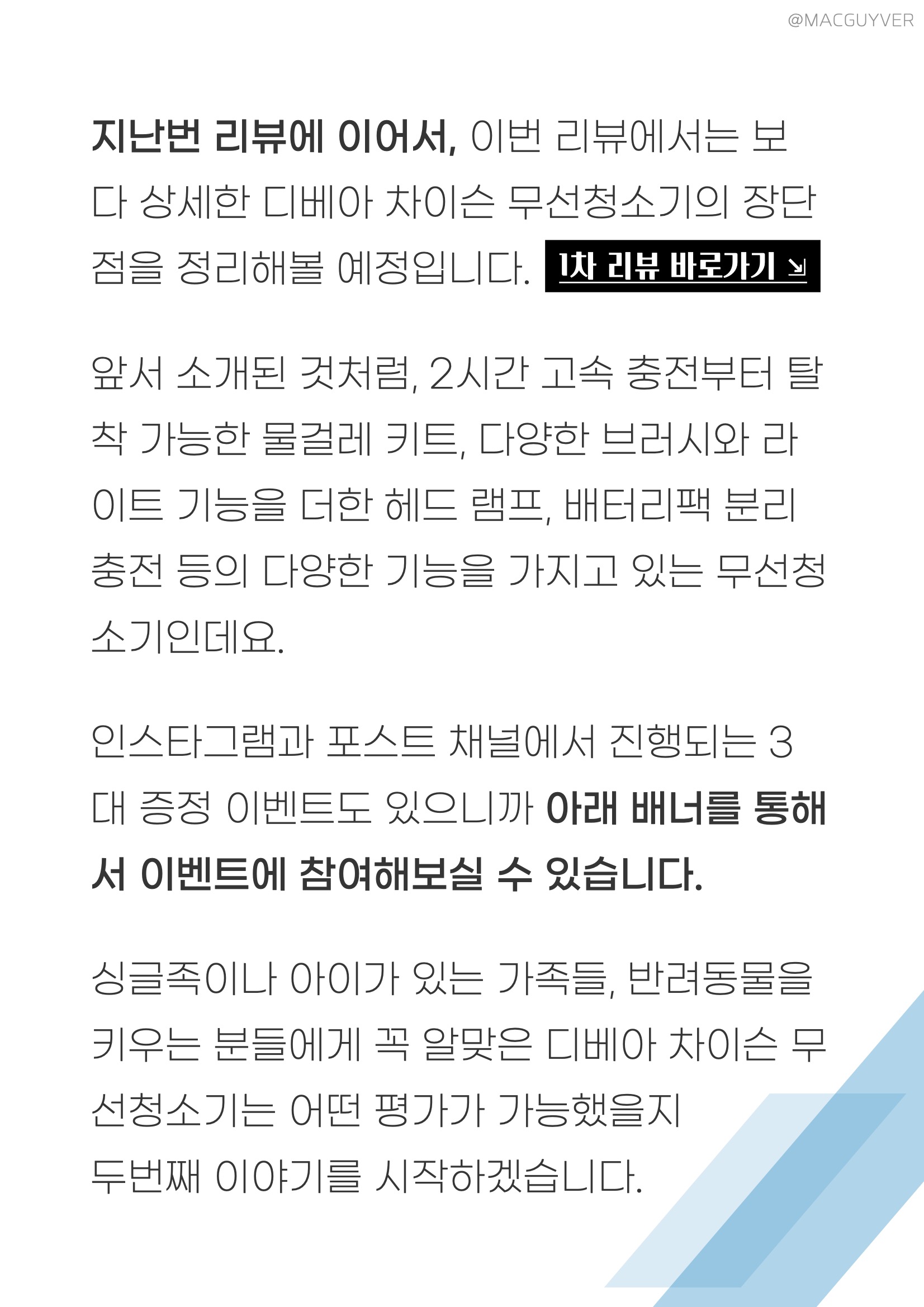 지난번 디베아무선청소기 리뷰에 이어서, 이번 리뷰에서는 보다 상세한 디베아 차이슨 무선청소기의 장단점을 정리해볼 예정입니다. 앞서 소개된 것처럼, 차이슨청소기 2시간 고속 충전부터 탈착 가능한 물걸레 키트, 다양한 브러시와 라이트 기능을 더한 헤드 램프, 배터리팩 분리 충전 등의 다양한 기능을 가지고 있는 무선청소기인데요. 또한 인스타그램과 포스트 채널에서 진행되는 디베아무선청소기 3대 증정 이벤트도 있으니까 관심이 있으신 분들은 아래 배너를 통해서 2in1청소기 이벤트에 참여해보실 수 있습니다. 무선청소기추천 싱글족이나 아이가 있는 가족들, 반려동물을 키우는 분들에게 꼭 알맞은 디베아 차이슨 무선청소기는 어떤 평가가 가능했을지 가성비청소기 두 번째 이야기를 시작해보겠습니다.