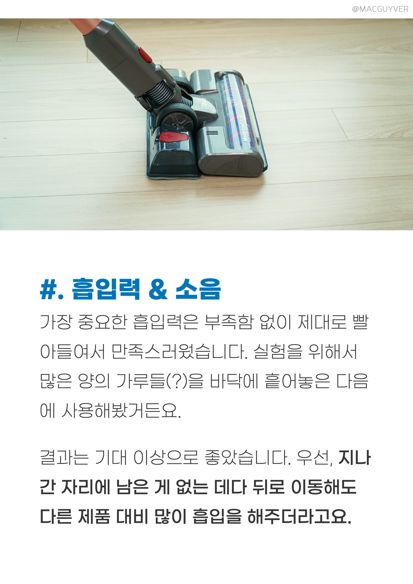 디베아무선청소기 멀티 브러시는 확실히 솔이 달려 있어서 블라인드를 비롯해서 평소에 먼지가 오래 쌓여있기 쉬운 곳을 쓸어주면서 청소하기에 알맞았는데요. 무선청소기추천 틈새 흡입 브러시는 창틀, 좁은 모서리와 같은 곳, 가구 사이를 청소하기에도 편리해서 가끔이지만 유용하게 사용하게 되더라고요. 원룸청소기 차이슨 청소기 메인 브러시 다음으로 자주 사용 중인 침구 브러시는 의자부터 소파, 차량 내부, 침구류까지 모두 다양하게 사용이 가능해서 편했습니다. 마찬가지로 차이슨청소기는 회전하면서 먼지를 제대로 흡입해 주니까 더 확실한 청소가 된다는 게 느껴졌는데요. 저렴한청소기 크기도 작고 모아서 흡입을 해주니까 집 먼지 진드기와 같은 아주 작은 녀석들도 제대로 흡입해 주지 않을까 싶더라고요. 디베아무선청소기 #. 디베아무선청소기 흡입력 & 소음 가장 중요한 흡입력은 부족함 없이 제대로 빨아들여서 만족스러웠습니다. 실험을 위해서 정말 많은 가루들(?)을 바닥에 흩어놓은 다음에 사용해봤거든요. 결과는 기대 이상으로 좋았습니다. 우선, 지나간 자리에 남은 게 없는 데다 뒤로 이동해도 다른 제품 대비 많이 흡입을 해주더라고요. 또 흡입력이 약한 청소기는 들어 올리면 가루나 알갱이가 많이 떨어지기도 하는데, 이 제품은 그런 증상 없이 깔끔하게 기기만 들려서 확실히 흡입력이 좋다는 것을 체감할 수 있었거든요.