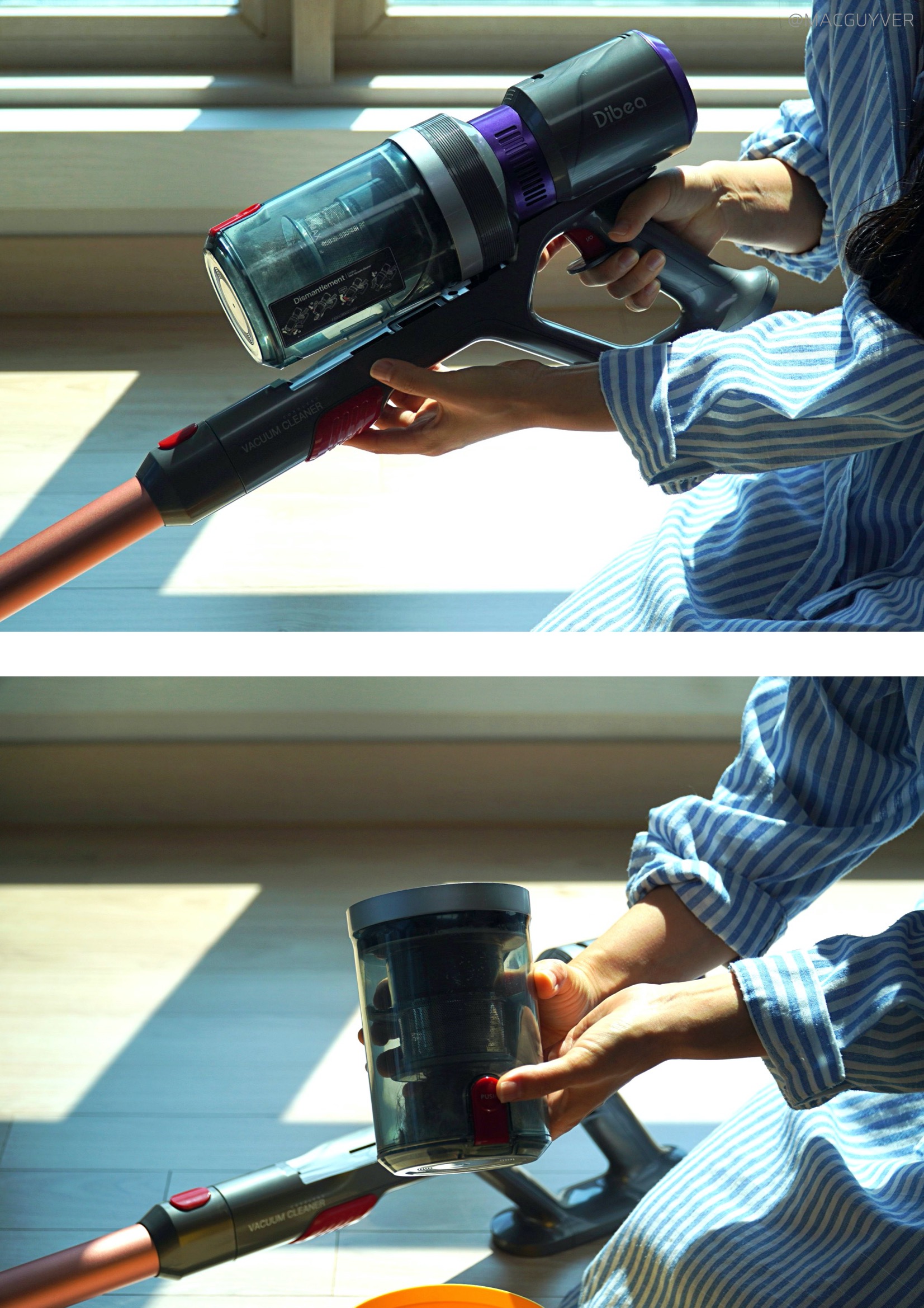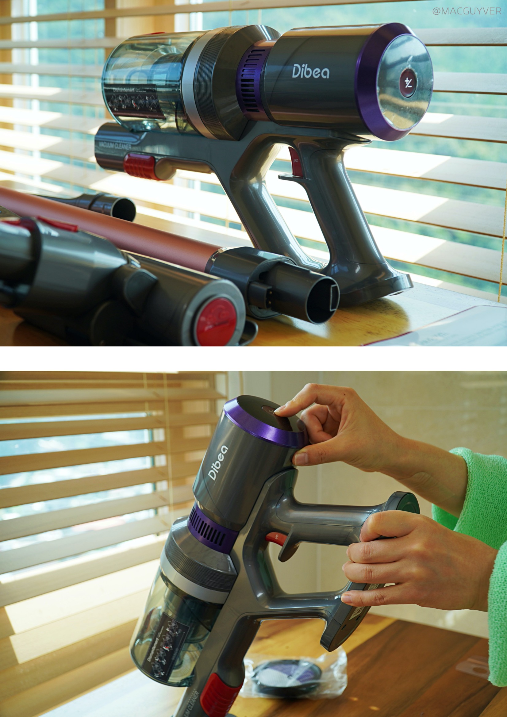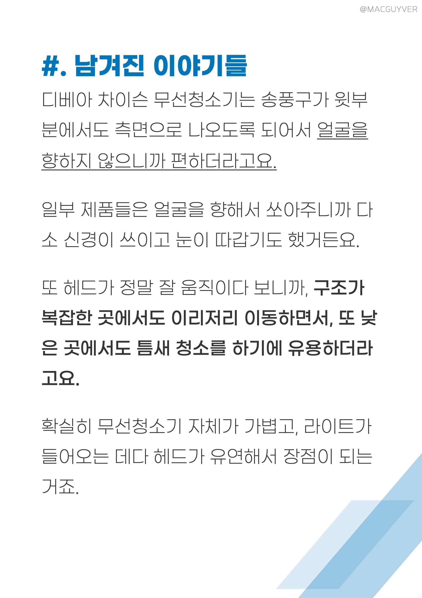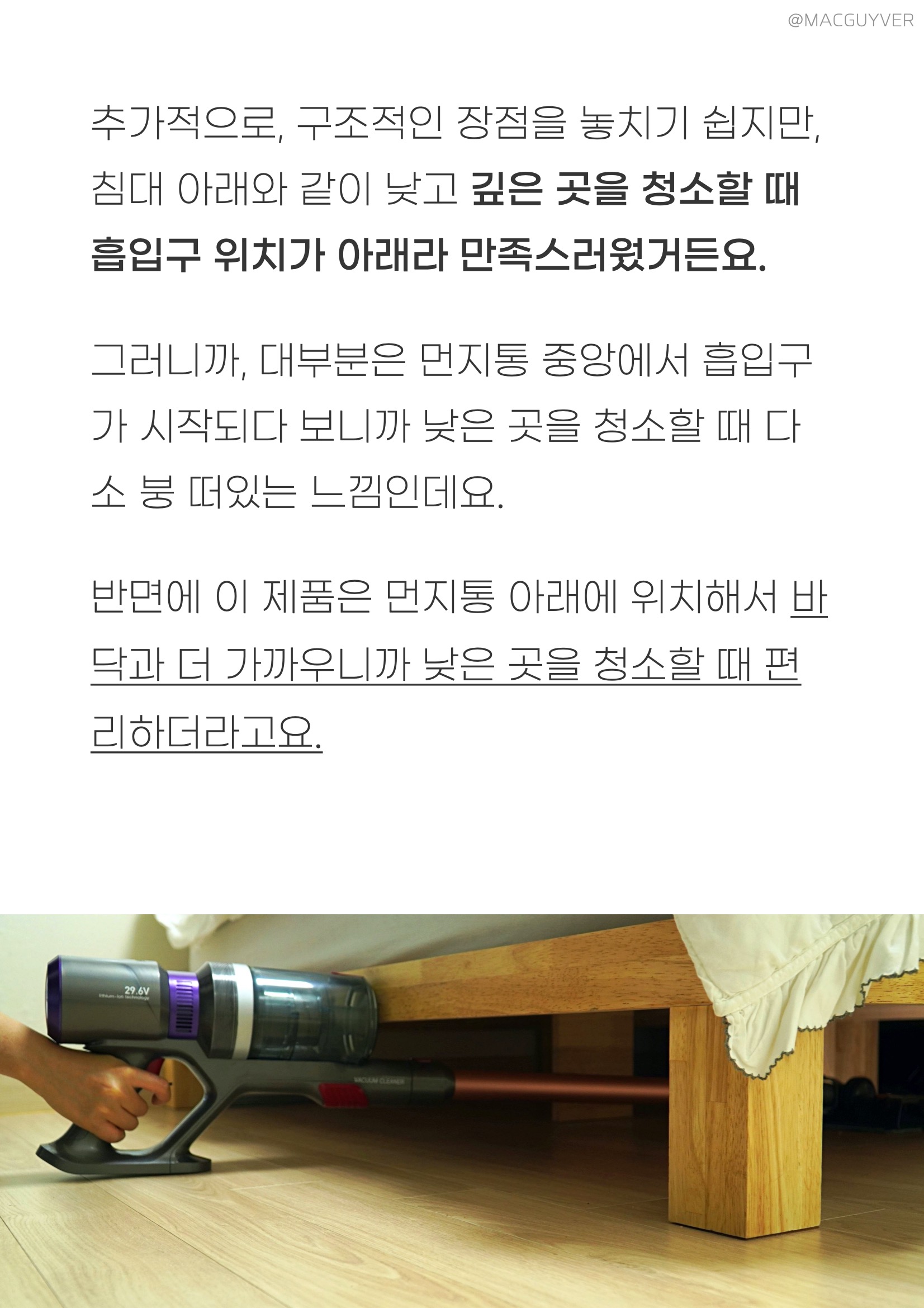 가성비청소기 #. 마감과 재질 의외로 청소기 후기에서 쉽게 보기 힘든 점 가운데는 마감과 재질이 있는데요. 사실 손이 닿는 제품이라면 마감이나 재질이 정말 중요해요. 그 점에서 디베아 차이슨 무선청소기는 손잡이 부분이 매끄럽고 걸리지 않아서 편리하더라고요. 거기다 각종 툴을 연결하고 탈착하는 부분에서도 스트레스가 없었거든요. 특히 인상적인 부분은 먼지통 분리에 있었습니다. 아래쪽 빨간 레버를 당겨서 열어준 다음에 돌려서 분리가 가능한데요. 확실히 제대로 분리가 되니까 편리하더라고요. 거기다 배터리팩은 위쪽 레버를 당기면서 뒤로 빼면 바로 탈착이 되니까 편하게 바로 분리해볼 수 있었습니다. 디베아무선청소기 마감과 재질에서 신경이 쓰이는 부분이라면 손잡이 아래 부분인데요. 여기는 끝부분이 살짝 날이 서 있는 느낌이고 부드럽게 마감되지 않은 느낌이 들더라고요. 사용할 때 만지는 일은 많이 없겠지만, 알아두시면 좋을 것 같습니다. 무선청소기추천 이외의 차이슨청소기 튜브나 헤드, 본체, 물걸레 키트는 모두 매끈하게 마감되어 있고 재질도 나쁘지 않아서 편하게 잡고 사용이 가능했습니다.
