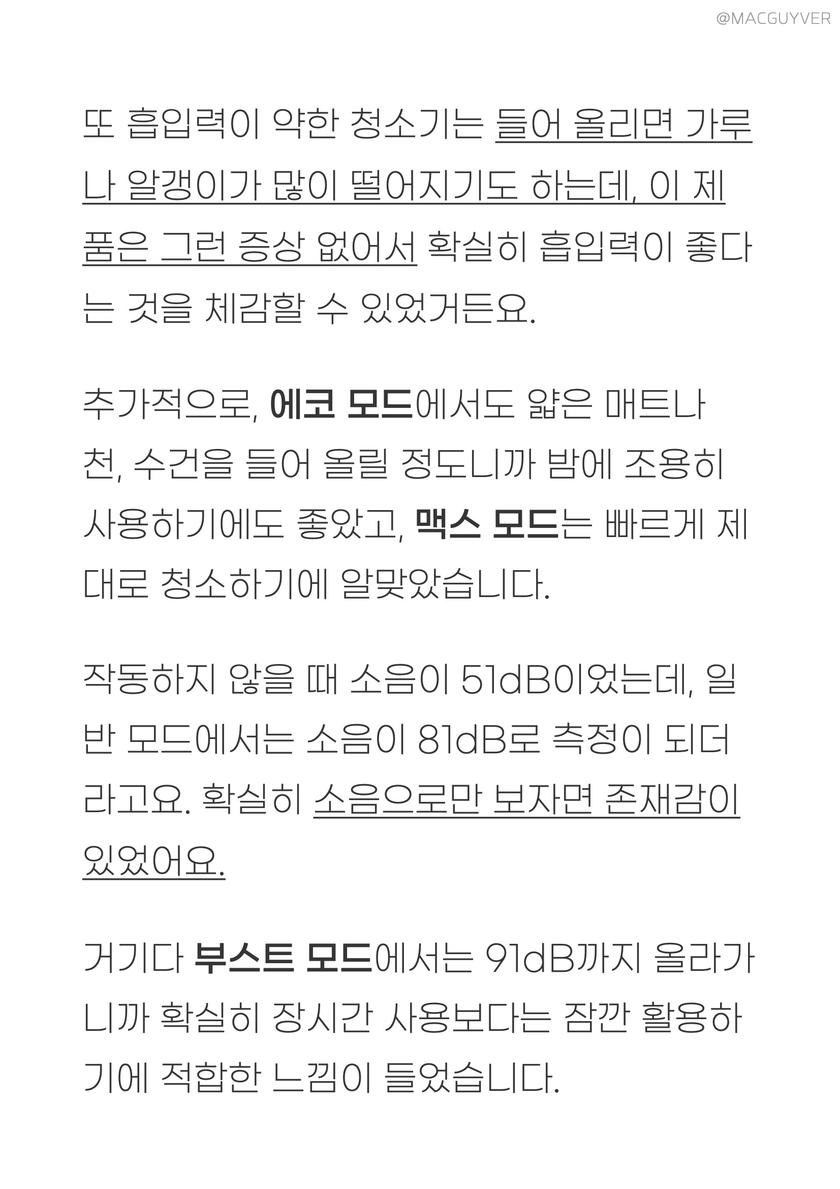 추가적으로, 디베아무선청소기 에코 모드에서도 얇은 매트나 천, 수건을 들어 올릴 정도니까 밤에 조용히 사용하기에도 좋았고, 맥스 모드는 빠르게 제대로 청소하기에 알맞았습니다. 작동하지 않을 때 소음이 51dB이었는데, 일반 모드에서는 소음이 81dB로 측정이 되더라고요. 확실히 소음으로만 보자면 존재감이 있었어요. 원룸청소기 거기다 부스트 모드에서는 91dB까지 올라가니까 확실히 장시간 사용보다는 잠깐 활용하기에 적합한 느낌이 들었습니다. 저렴한청소기 #. 차이슨청소기 남겨진 이야기들 디베아 차이슨 무선청소기는 송풍구가 윗부분에서도 측면으로 나오도록 되어서 얼굴을 향하지 않으니까 편하더라고요. 일부 제품들은 얼굴을 향해서 쏘아주니까 다소 신경이 쓰이고 눈이 따갑기도 했거든요. 또 디베아무선청소기 헤드가 정말 잘 움직이다 보니까, 구조가 복잡한 곳에서도 이리저리 이동하면서, 또 낮은 곳에서도 틈새 청소를 하기에 유용하더라고요.