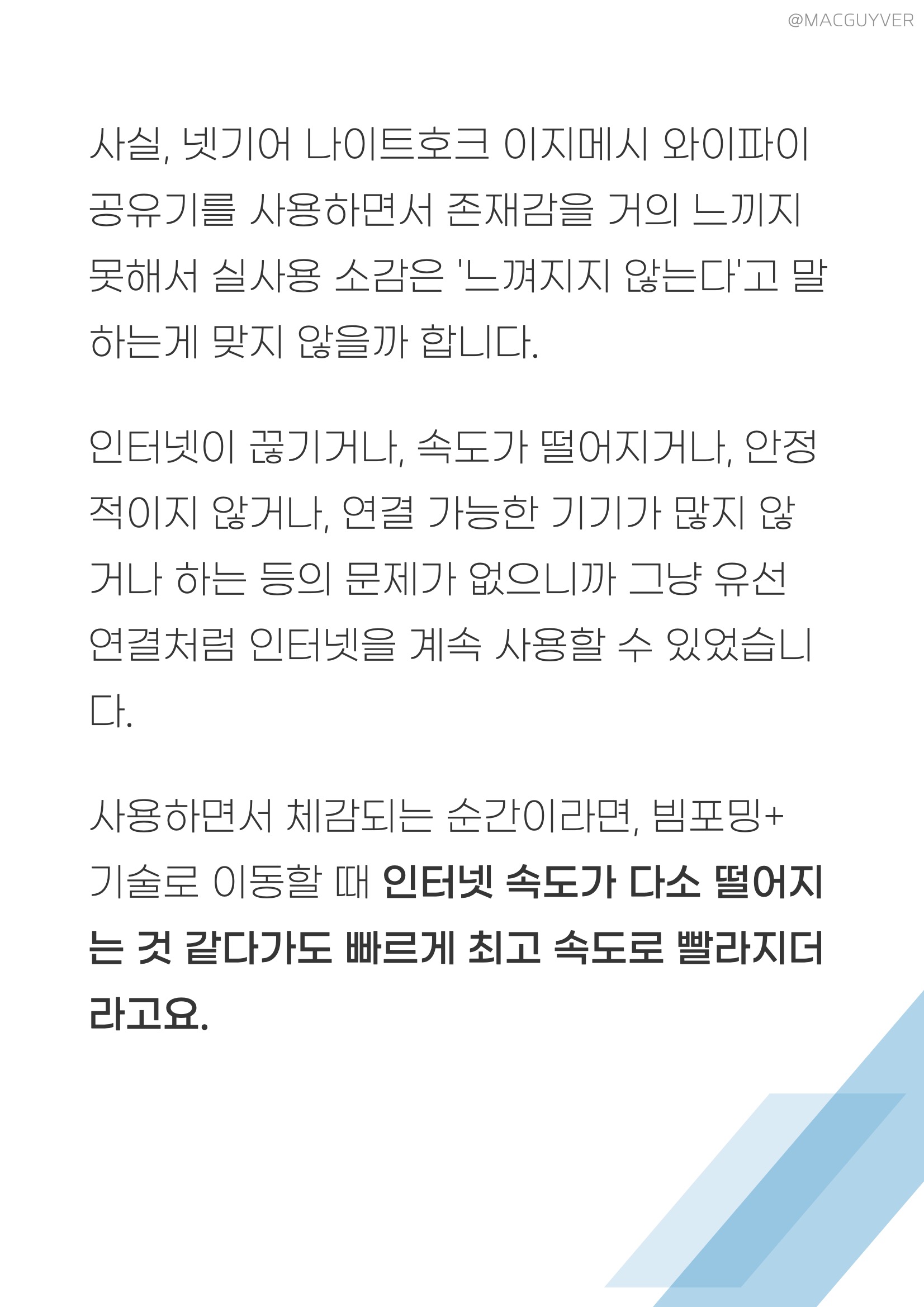 와이파이 공유기 실사용 :: 직접 사용해본 소감이라면, 확실히 와이파이 음영 지역에 대한 고민이 줄어들었습니다. 거실에 하나, 방에 하나, 주방에 하나 놓아두니까 서로 엮이면서 촘촘한 와이파이를 제공해 줬거든요. 무선 공유기 특히 2.4Ghz와 5Ghz를 별도로 연결하는 방식이 아니라, 인터넷 공유기 하나의 인터넷 신호를 잡기만 하면 알아서 거리에 따라 2.4Ghz로 연결해 주거나, 혹은 더 빠른 5Ghz로 변경해 주니까 넷기어 나이트호크 안정성과 편의성이 둘 다 장점이 되더라고요. 별도의 소음도 없고 발열도 거의 느껴지지 않아서 무선 공유기 가볍게 설치하는 것만으로 편리한 인터넷 사용을 할 수 있었는데요. 이지메시 와이파이 공유기 넷기어 나이트호크 20개가 넘는 기기를 연결하고, 화상 업무와 자료 다운/업로드를 동시에 하면서도 스마트폰으로 측정해본 인터넷 속도는 상당히 빠르게 나왔습니다. 메시 와이파이 공유기 와이파이6 기술 가운데 하나인 OFDMA를 체감할 수 있었는데요. 한 번에 하나의 기기에만 데이터가 전송되는 기존 방식과 다르게, 메시 공유기 추천 다중 기기에 동시에 최적화된 속도를 보여줘서 넷기어 공유기 안정적이면서도 빠른 속도를 경험할 수 있거든요.