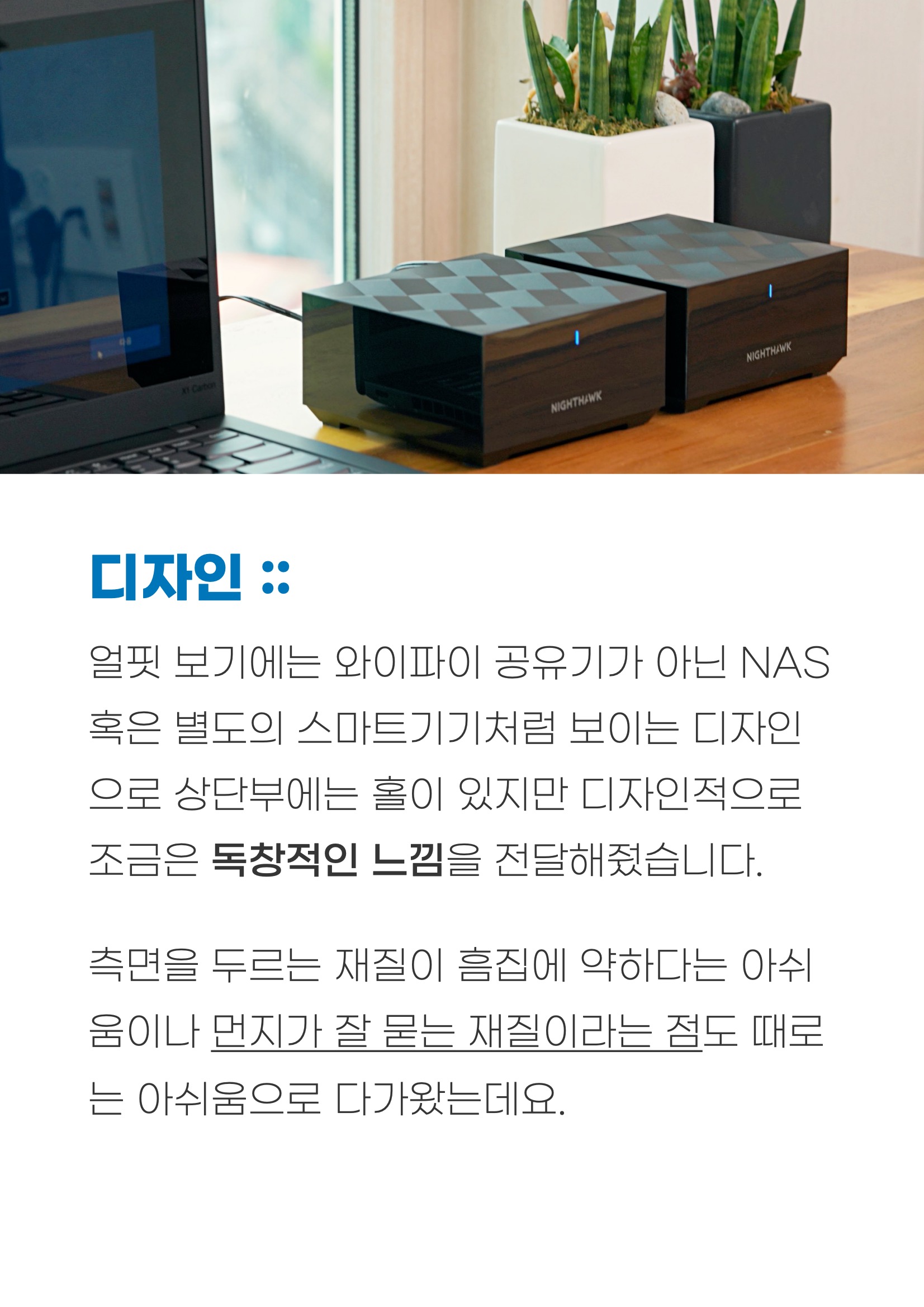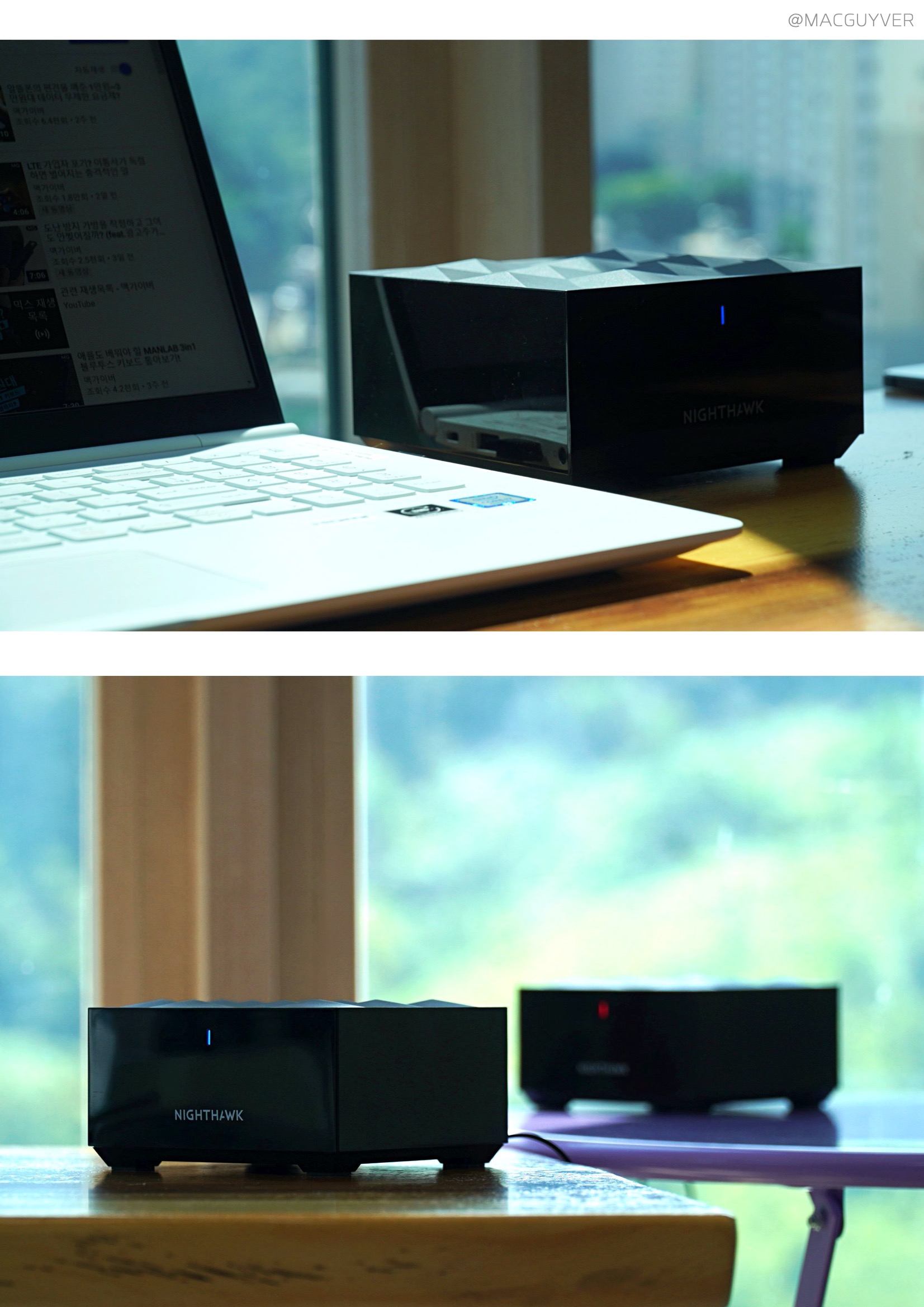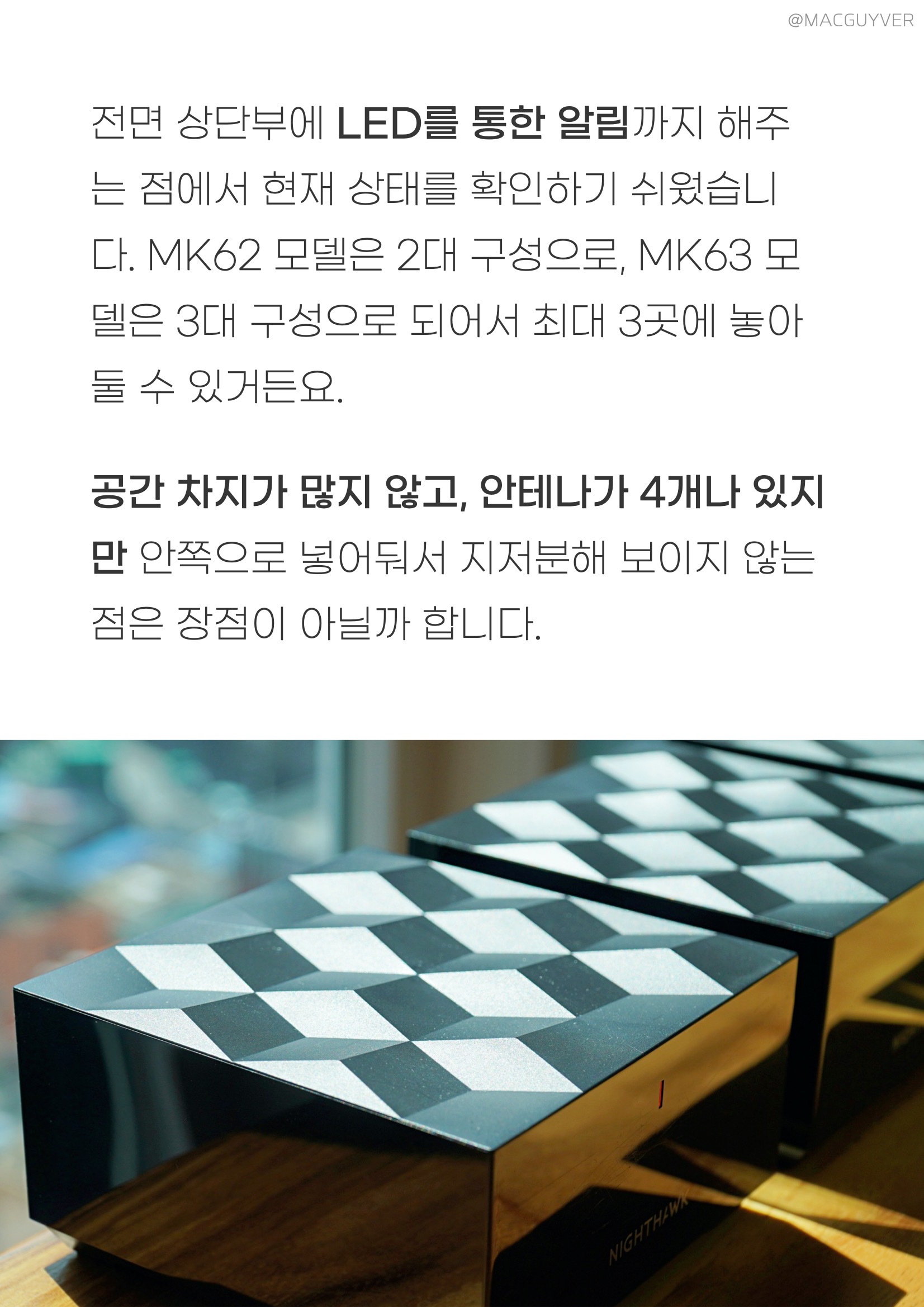이지메시 와이파이 공유기 주요 특징 :: 와이파이6, 이지메시 표준을 지원하면서 동시 듀얼 밴드 와피아피6 지원으로 안정적인 속도를 지원합니다. 넷기어 공유기 1.5GHz 쿼드 코어 프로세서, 4개의 고성능 내장 안테나와 최대 300제곱미터의 커버리지를 제공한다고 하거든요. 넷기어 나이트호크 장점이라면 공유기 1대에서 발생되기 쉬운 음영 지역을 최소화해서 가능한 넓은 범위를 더 안정적으로 인터넷 사용이 가능해도록 해주는 데 있습니다. 이지메시 와이파이 공유기 TMI : 하나의 와이파이 이름으로 연결해도 자동으로 공유기를 이동하면서 연결이 끊어지지 않아서 더 안정적인 사용이 가능합니다. 메시 와이파이 공유기 디자인 :: 얼핏 보기에는 와이파이 공유기로 보이기보다는 NAS 혹은 별도의 스마트기기처럼 보이는 디자인으로 상단부에는 홀이 있지만 디자인으로 조금은 독창적인 느낌을 전달해 줬습니다. 넷기어 공유기 측면을 두르는 재질이 흠집에 약하다는 아쉬움이나 먼지가 잘 묻는 재질이라는 점도 때로는 아쉬움으로 다가왔는데요. 메시 공유기 추천 무선 공유기 전면 상단부에 LED를 통한 알림까지 해주는 점에서 현재 상태를 확인하기 쉬웠습니다. 와이파이 공유기 MK62 모델은 2대 구성으로, MK63 모델은 3대 구성으로 되어서 최대 3곳에 놓아둘 수 있거든요. 이지메시 와이파이 공유기 공간 차지가 많지 않고, 안테나가 4개나 있지만 안쪽으로 넣어둬서 지저분해 보이지 않는 점은 장점이 아닐까 합니다.