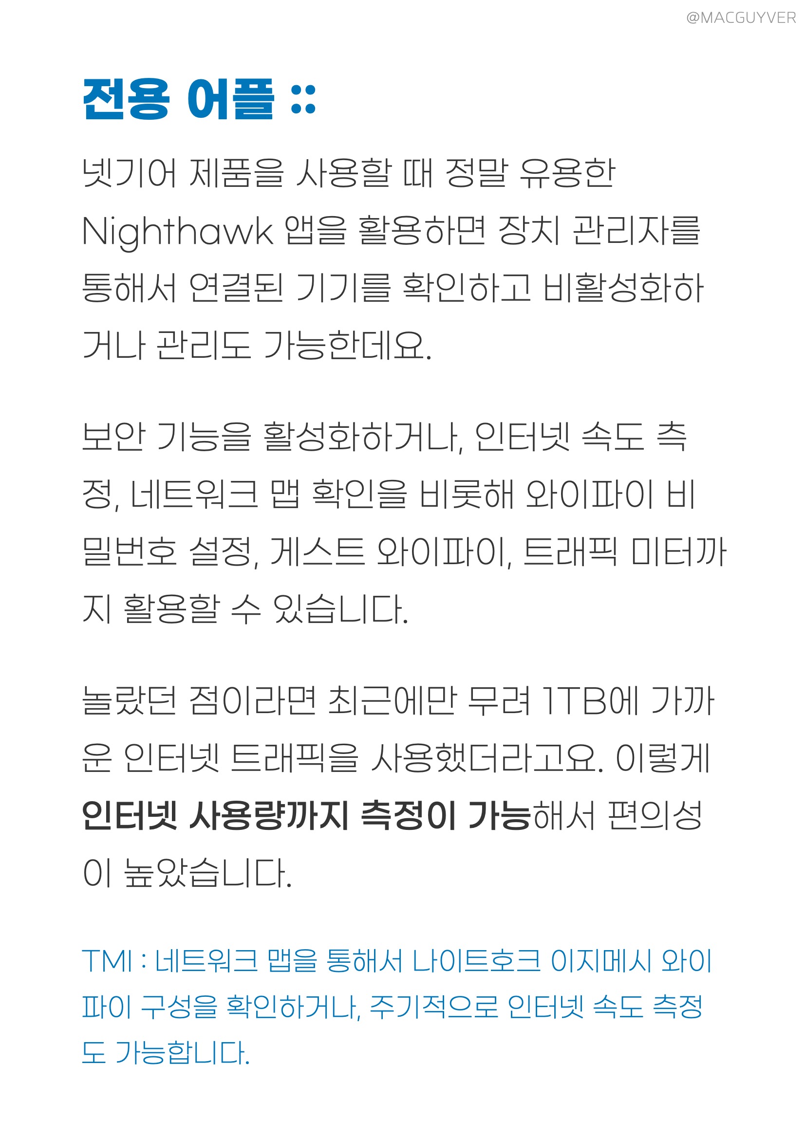 메시 와이파이 공유기 설치 과정 :: 생각보다 간단했는데요. 기기별로 어댑터 하나와 본체 하나 구성이고, 메인 제품에만 랜선을 연결해 주면 그만이기 때문에 설치는 정말 쉬웠습니다. 이외의 과정은 전용 앱으로 설정해 주면 알아서 3대의 기기가 하나로 묶이면서 전체 설정이 끝나기 때문에 번거롭지도 않더라고요. 알아두실 점이라면, 인터넷 공유기 메인 제품인 라우터를 포함해 유선 이더넷 연결 단자는 하나씩 탑재되어 있거든요. 그래서 유선 연결을 많이 하시려는 분들보다는 무선 인터넷을 촘촘하게 구성하시려는 분들에게 조금 더 적합한 제품입니다. 넷기어 나이트호크 전용 어플 :: 넷기어 제품을 사용할 때 정말 유용한 Nighthawk 앱을 활용하면 장치 관리자를 통해서 연결된 기기를 확인하고 비활성화하거나 관리도 가능한데요. 무선 공유기 보안 기능을 활성화하거나, 인터넷 속도 측정, 네트워크 맵 확인을 비롯해 와이파이 비밀번호 설정, 게스트 와이파이, 트래픽 미터까지 활용할 수 있습니다. 놀랐던 점이라면 최근에만 무려 1TB에 가까운 인터넷 트래픽을 사용했더라고요. 이렇게 와이파이 공유기 인터넷 사용량까지 측정이 가능해서 편의성디 높았습니다. 무선 공유기 TMI : 네트워크 맵을 통해서 나이트호크 이지메시 와이파이 구성을 확인하거나, 주기적으로 인터넷 속도 측정도 가능합니다.