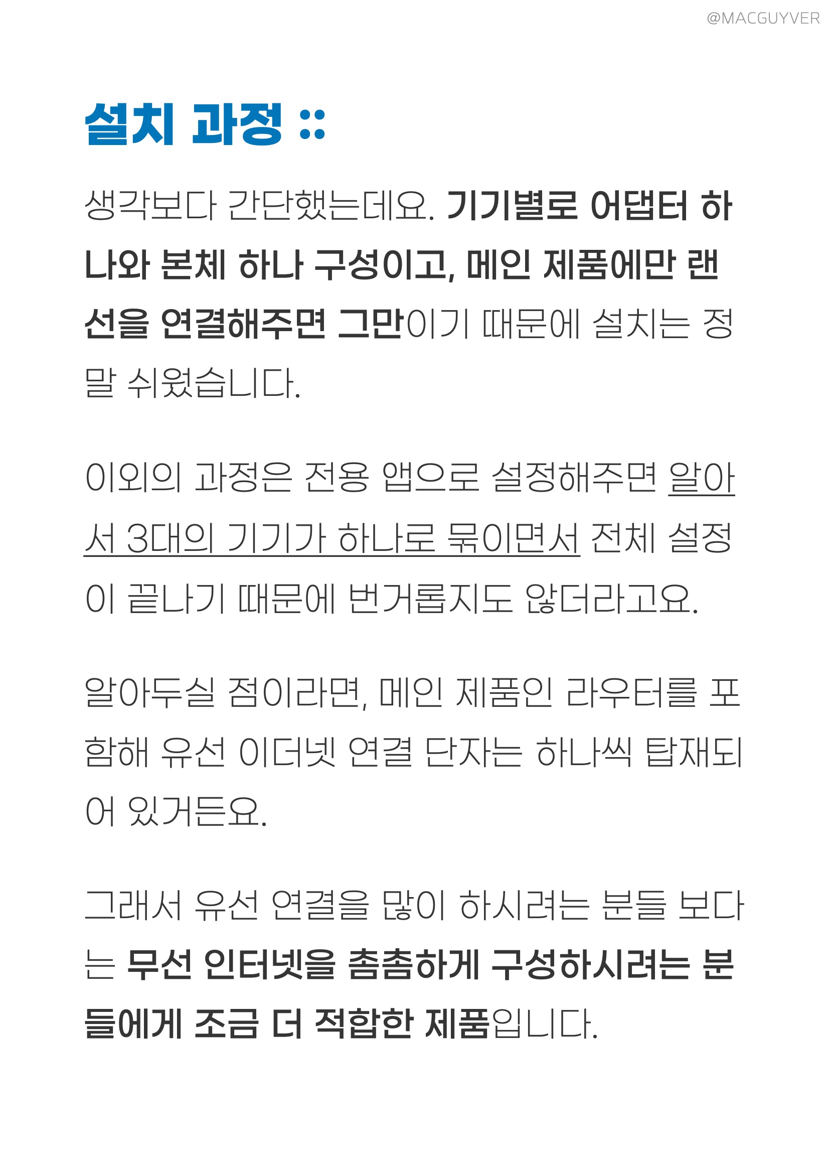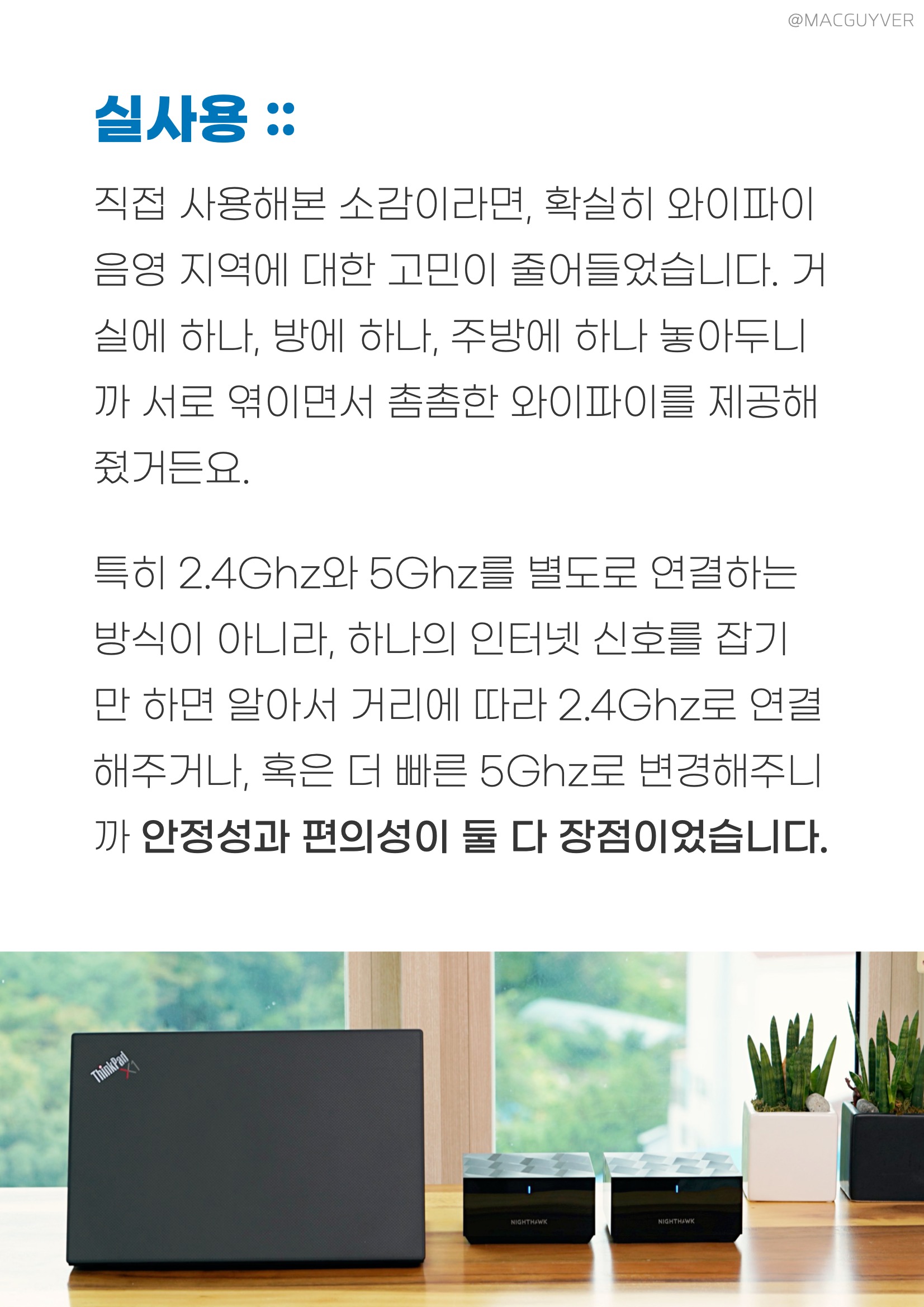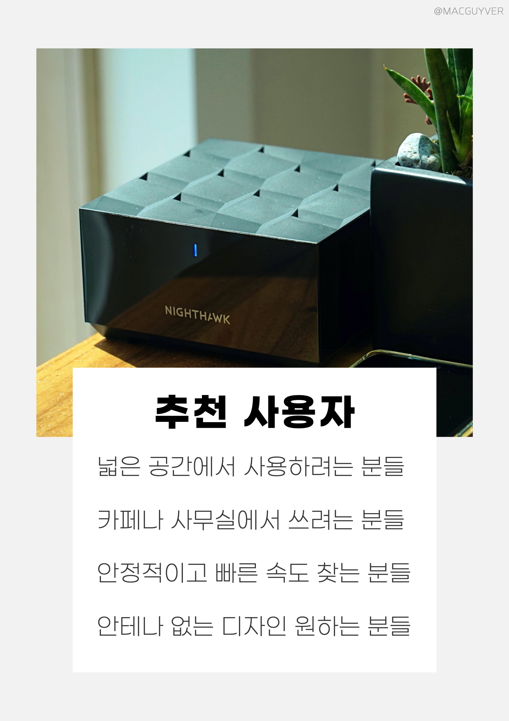 사실,와이파이 공유기 넷기어 나이트호크 이지메시 와이파이 공유기를 사용하면서 존재감을 거의 느끼지 못해서 메시 공유기 추천 실사용 소감은 '느껴지지 않는다’라고 말하는 게 맞지 않을까 합니다. 이지메시 와이파이 공유기 인터넷이 끊기거나, 속도가 떨어지거나, 안정적이지 않거나, 연결 가능한 기기가 많지 않거나 하는 등의 문제가 없으니까 그냥 유선 연결처럼 인터넷을 계속 사용할 수 있었습니다. 이지메시 와이파이 공유기 사용하면서 체감되는 순간이라면, 빔포밍+ 기술로 이동할 때 인터넷 속도가 다소 떨어지는 것 같다가도 빠르게 최고 속도로 빨라지더라고요. 그러니까, 와이파이 신호를 무작정 아무 곳으로 보내는 게 아니라 연결된 기기를 향해서 쏴주니까 위치를 확인하게 되면 더 빠르고 안정적인 사용을 할 수 있는 거죠. 메시 와이파이 공유기 통합 1.8Gbps의 속도로 인터넷을 활용할 수 있기 때문에 촘촘한 와이파이 환경 구축을 원하시는 분들에게 적합한 제품이 아닐까 합니다. 앞서 소개 드린 것처럼, 각 기기별로 이더넷 단자가 하나이기 때문에 유선 연결을 많이 하려는 목적과는 조금 맞지 않습니다. 그리고 디자인이 깔끔해 보이기도 하지만 넷기어 나이트호크 검은색이기도 하고 네모난 디자인이라 존재감이 있을 수도 있어요. 인터넷 공유기 인테리어에 따라서 달라지니까 제품의 디자인과 컬러도 참고할 필요가 있을 것 같네요. 넷기어 나이트호크 추천 사용자 :: 넓은 공간에서 사용하려는 분들 카페나 사무실에서 쓰려는 분들 안정적이고 빠른 속도 찾는 분들 안테나 없는 디자인 원하는 분들
