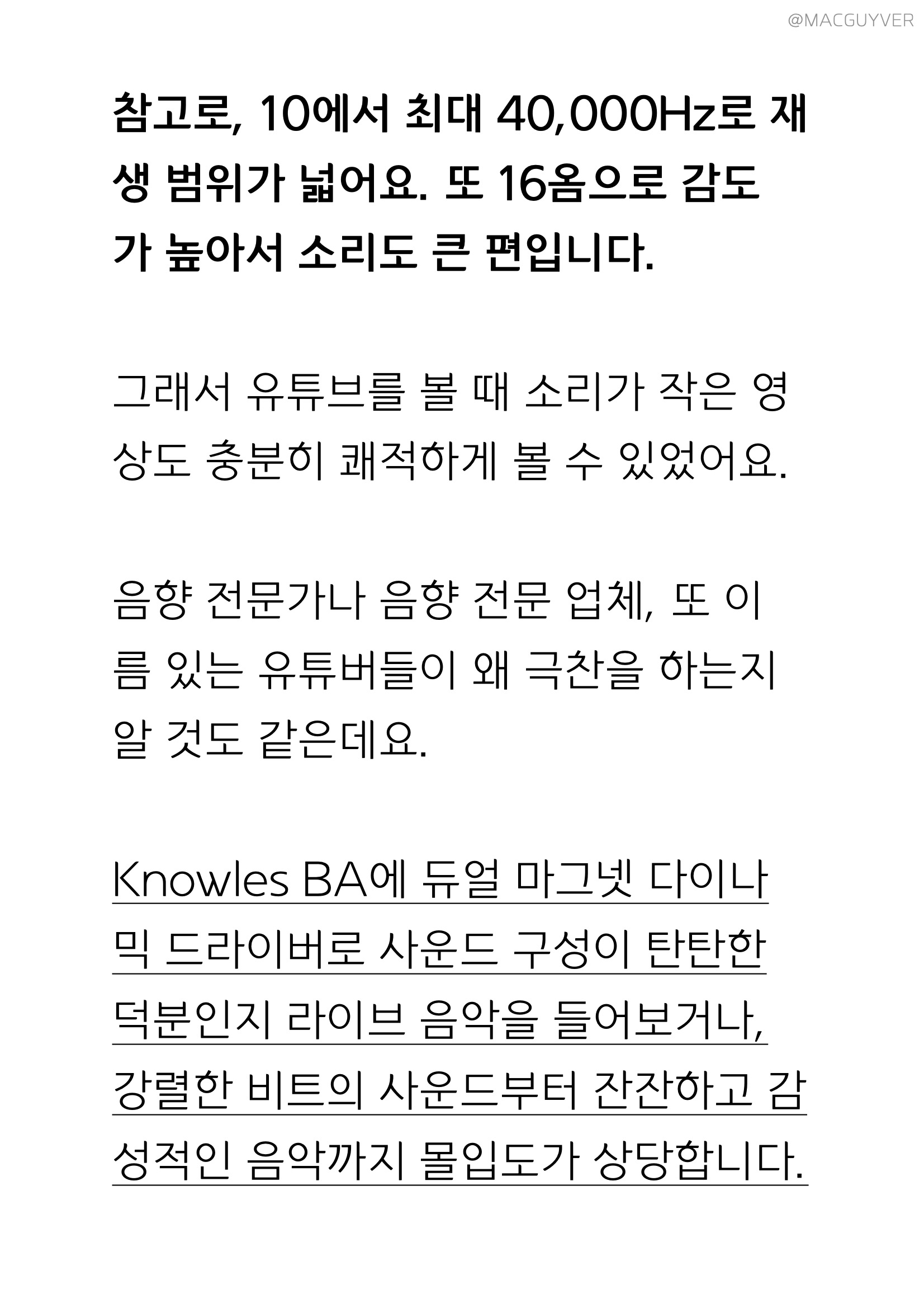TRN 유선 이어폰 추천 참고로, 10에서 최대 40,000Hz로 재생 범위가 넓어요. 또 16옴으로 감도가 높아서 소리도 큰 편입니다. 그래서 유튜브를 볼 때 소리가 작은 영상도 충분히 쾌적하게 볼 수 있더라고요. 음향 전문가나 음향 전문 업체, 또 이름 있는 유튜버들이 왜 음질 좋은 이어폰으로 극찬을 하는지 알 것도 같은데요. Knowles BA에 듀얼 마그넷 다이나믹 드라이버로 사운드 구성이 탄탄한 덕분인지 라이브 음악을 들어보거나, 강렬한 비트의 사운드부터 잔잔하고 감성적인 음악까지 몰입도가 상당합니다. 그래서 이 가격대 무선 이어폰과는 사실상 비교가 안되기도 하고, 유선 이어폰으로도 이 가격대에서 더 뛰어난 제품을 찾기가 힘들지 않을까 싶어요. 특별한 색깔 없이 밸런스가 잘 맞춰진 고음질 이어폰 사운드라 누구든 취향에 맞춰서 들어볼 수 있을 것 같은 거죠.