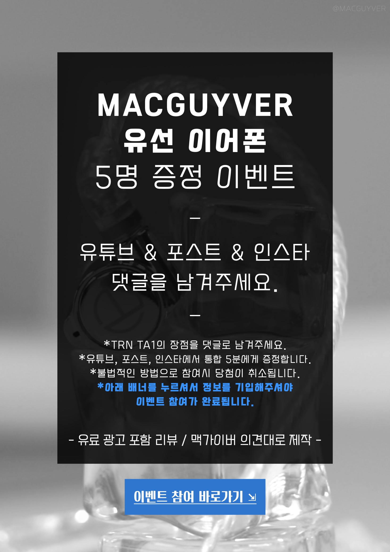 이어폰 추천 조금 신기했던 건, 해외 직구로 구입하는 가격이랑 국내 공식 수입원인 비아 컴퍼니에서 구입하는 가격이 거의 같다는 점인데요. TRN 해외 구매는 AS도 중고 판매도 안되지만, 국내 정식 구매라 1년 AS에 다양한 사후 지원까지 가능하니까 여기서 더 가성비라는 말이 나오기도 하더라고요. 아마 인이어를 처음 구입하려는 분들이나, 충전부터 분실 걱정 없이 고음질을 경험하고 싶은 분들에게 4만원대 가성비로 만나볼 수 있는 음질 좋은 이어폰, 추천할 만한 이어폰이 아닐까 합니다. 아쉬움이나 단점을 가격으로 커버한 제품이라 딱히 크게 아쉽다고 할 만한 점이 없기도 했는데요. TRN 브랜드에 가성비 좋은 라인업도 많으니까 다른 제품에도 관심이 가더라고요. 유선 이어폰 추천 새로 아이맥을 구입했거나, 아니면 유선 이어폰으로 제대로 음악과 영화를 감상하고 싶은 분들이라면 에어팟 맥스 이어 쿠션보다 훨씬 저렴한 TRN TA1을 알아보시는 것도 좋을 것 같습니다. 이어폰 추천 앞서 소개 드린 것처럼 5분에게 TRN TA1을 증정해드리는 이벤트도 진행 중이니까 포스트와 유튜브, 인스타를 통해 참여해보세요. 고음질 이어폰 TRN TA1이 궁금하신 분들은 아래 배너를 통해 제품에 대한 보다 상세한 정보와 실구매자 리뷰를 보실 수 있습니다.